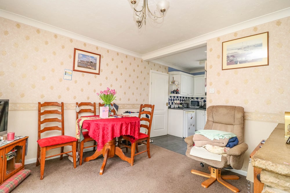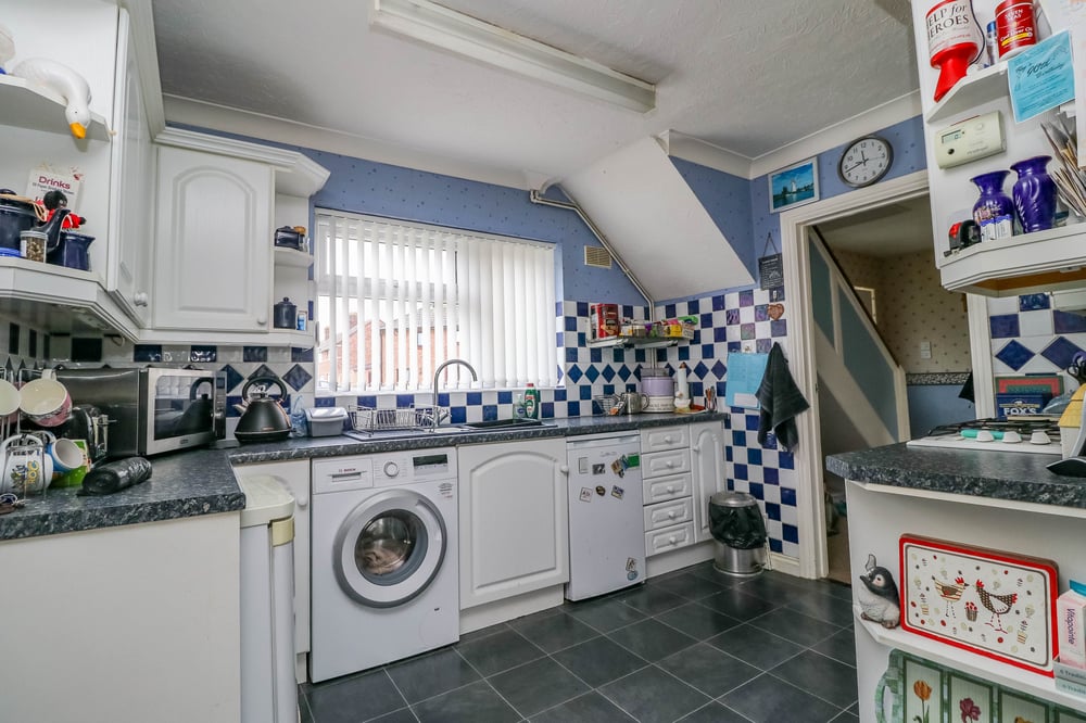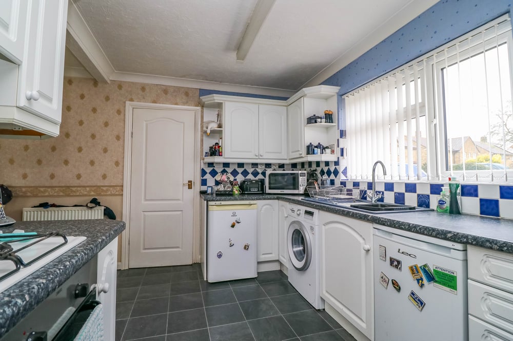 10' 11" x 8' 04" (3.33m x 2.54m) Double glazed window to front, range of wall and base units, laminate worktop, tiled splash back, integrated oven, gas hob, over head cooker fan, one and a half bowl sink with right hand drainer, space for fridge, freezer and washing machine.