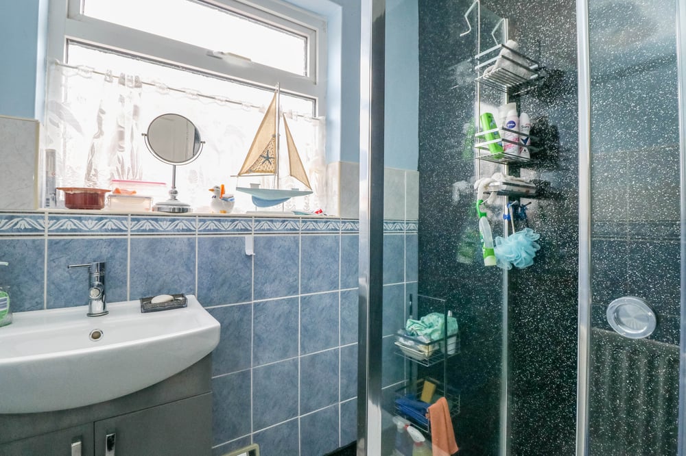 Double glazed obscured window to side, radiator, vanity unity, part tiled, double shower enclosure.