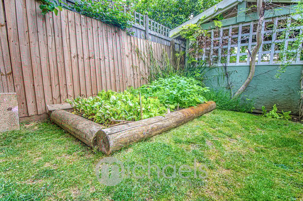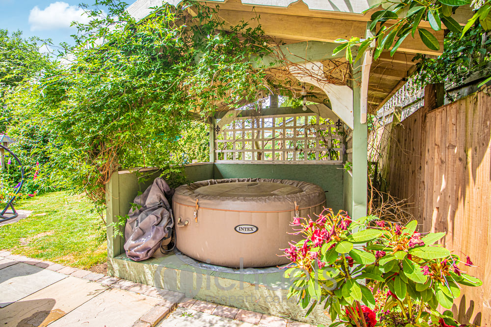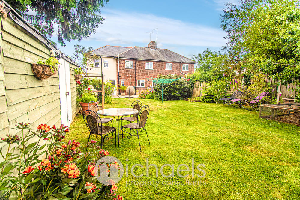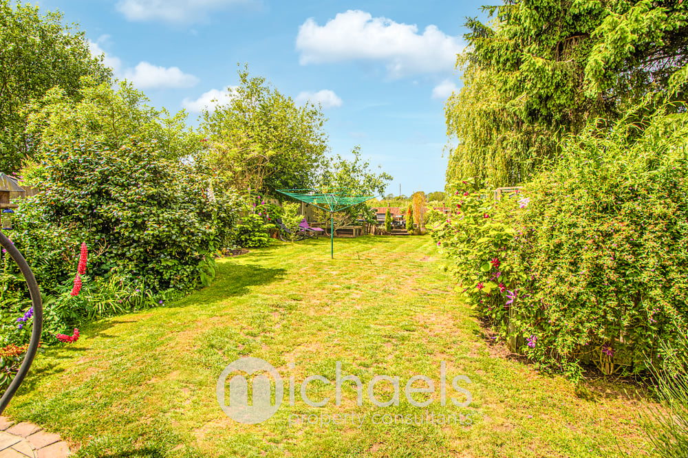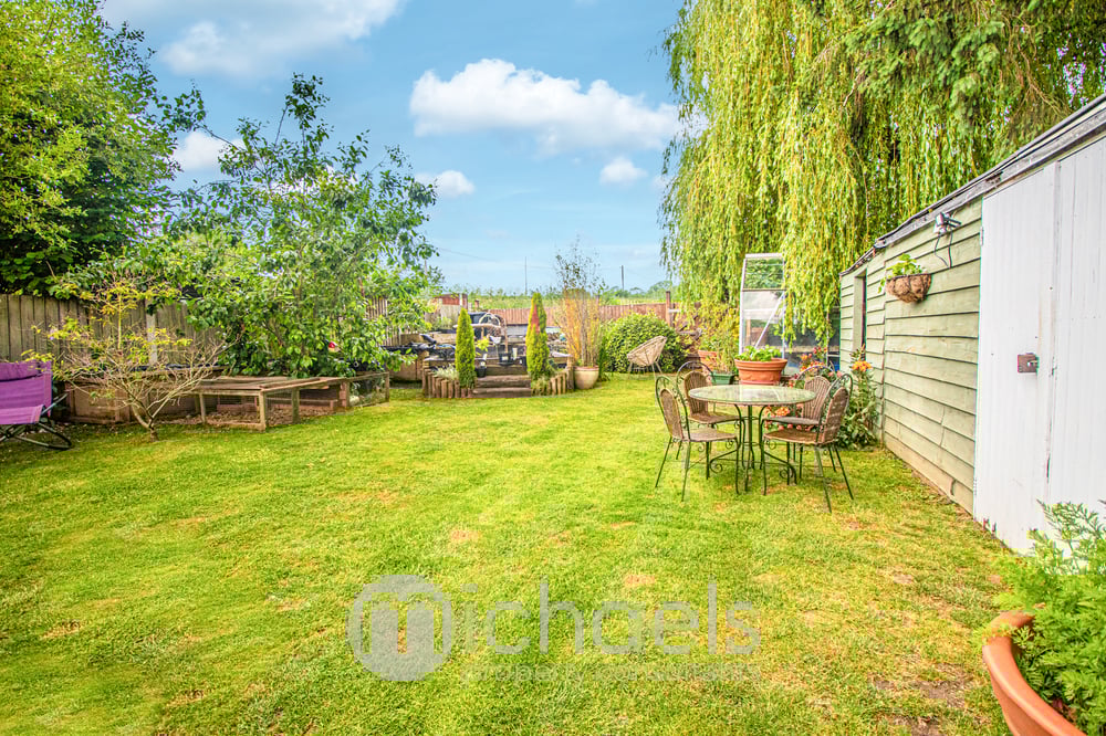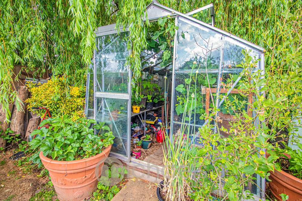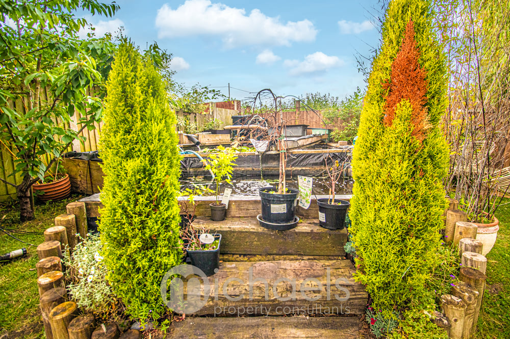 Commencing with patio area, majority laid to lawn, mature shrub and flower bed borders, wooden out buildings, greenhouse, backing onto fields, pond structure, access to front of property, outside tap, outside light.