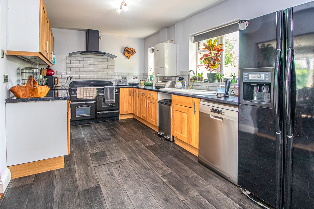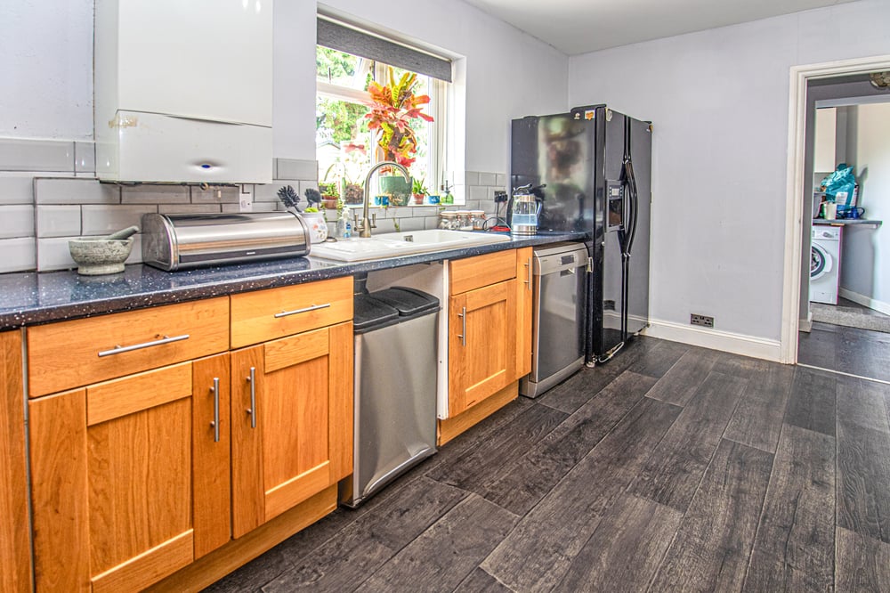 15' 07" x 8' 08" (4.75m x 2.64m) Smooth ceiling, double glazed windows to rear aspects, matching wall and base units with rolled edge worksurfaces, inset porcelain sink with bowl and drainer, space for american style fridge freezer, space for oven with ceramic hob and extractor over, luxury vinyl flooring.
