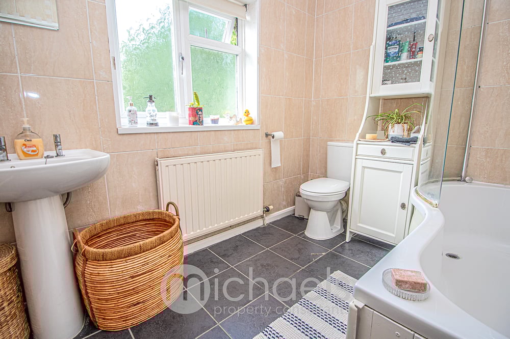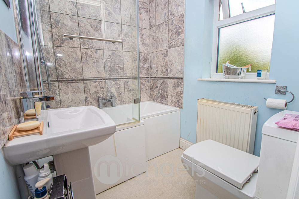 8' 10" x 6' 07" (2.69m x 2.01m) Smooth ceiling, inset spotlights, radiator, double glazed obscure window to rear aspect, low level WC, pedestal wash hand basin, extractor fan, panelled bath with shower attachment, fully tiled walls, tiled flooring.
