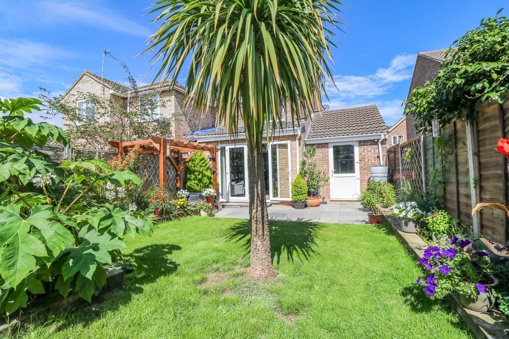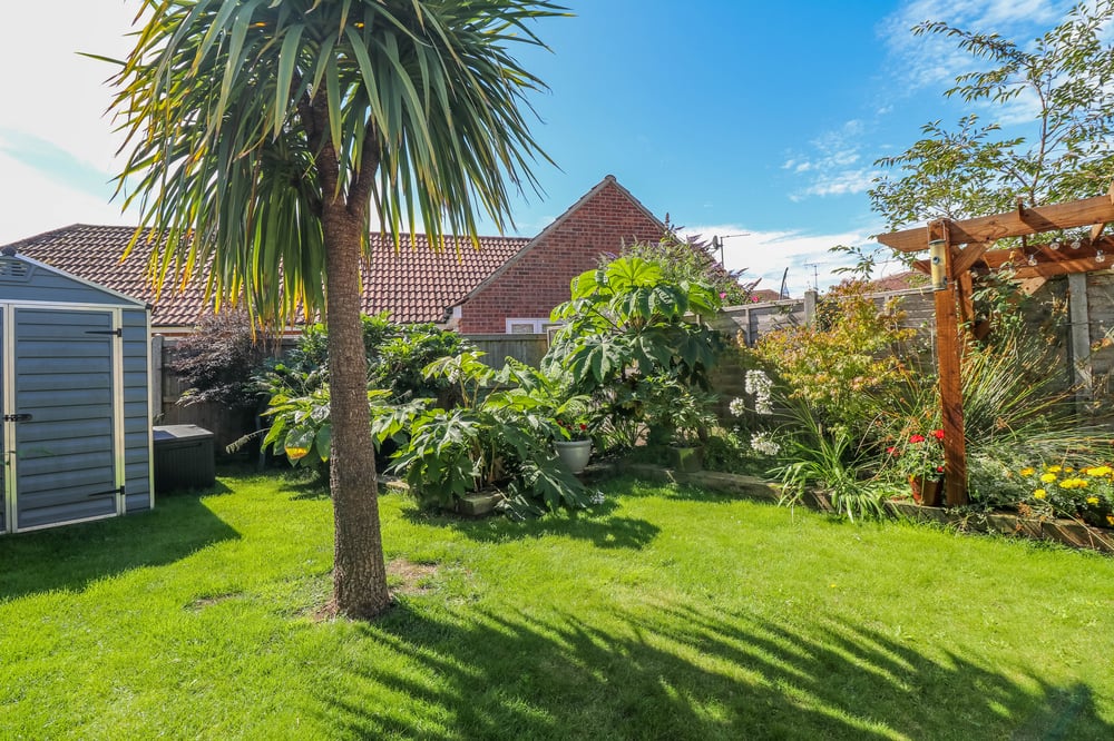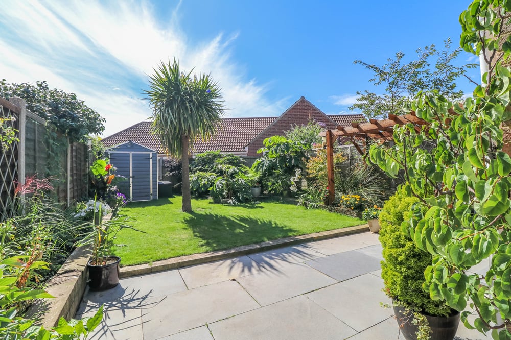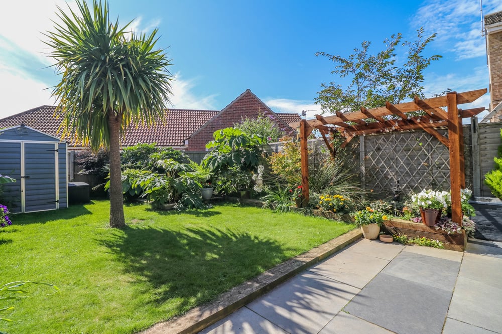 A well maintained private rear garden laid to lawn, planted boarder, pergola, water feature, garden shed, mature shrubs and trees, retained by fencing.