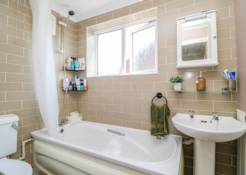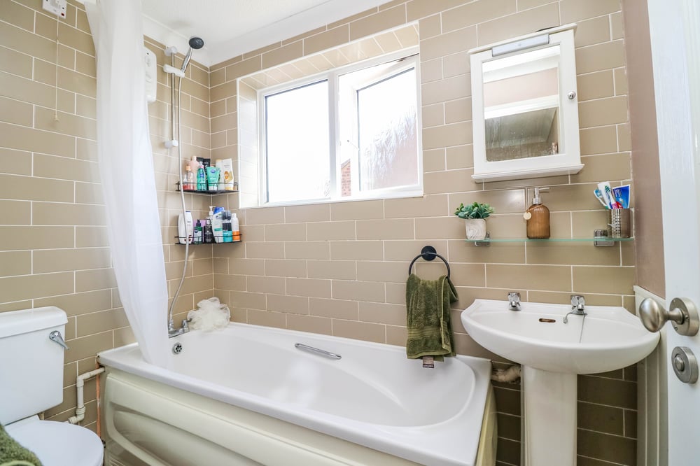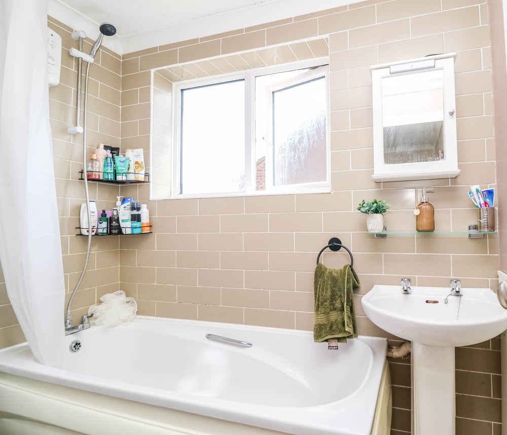 Double glazed obscure window to side, inset spots, low level WC, wash hand basin, panelled bath, part tiled walls.