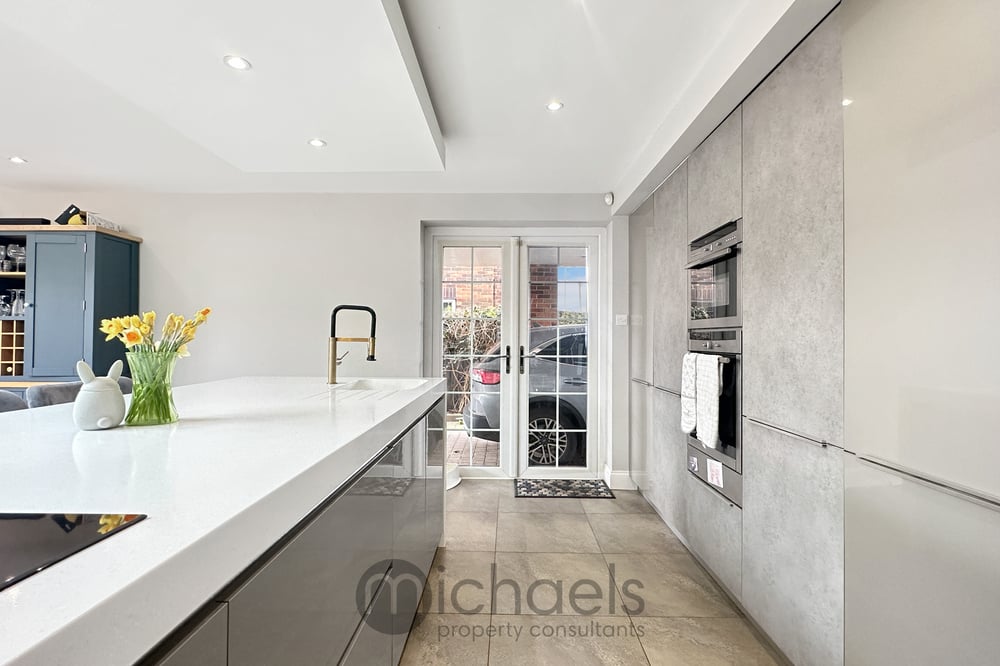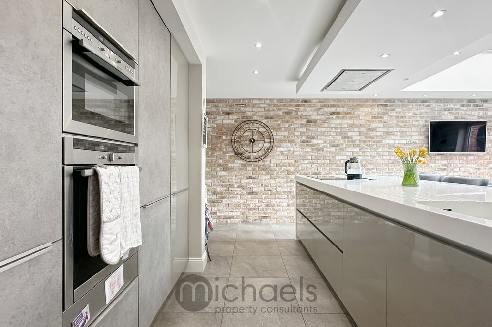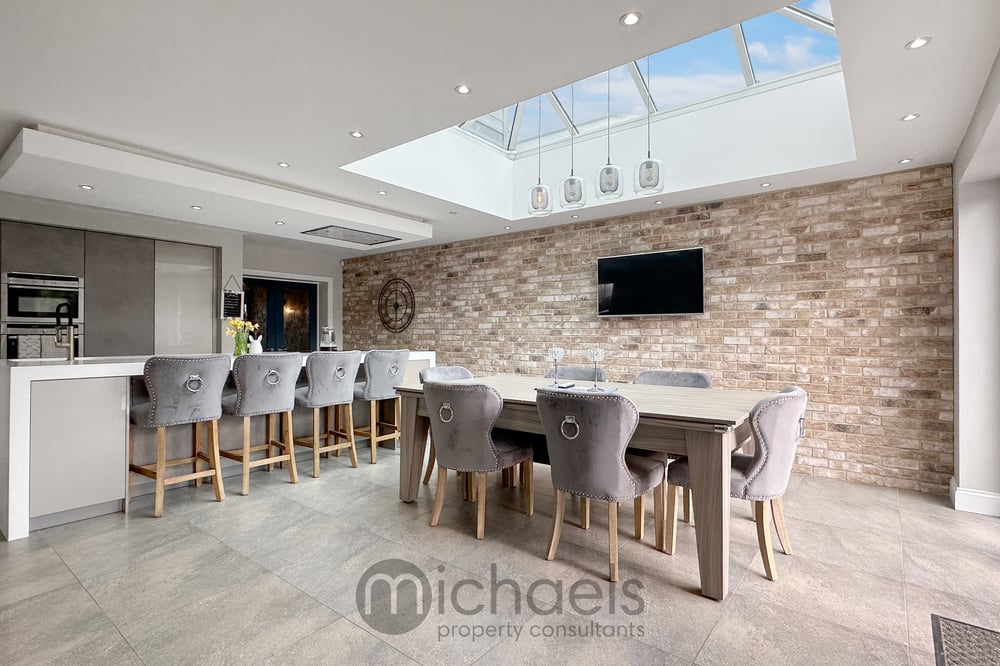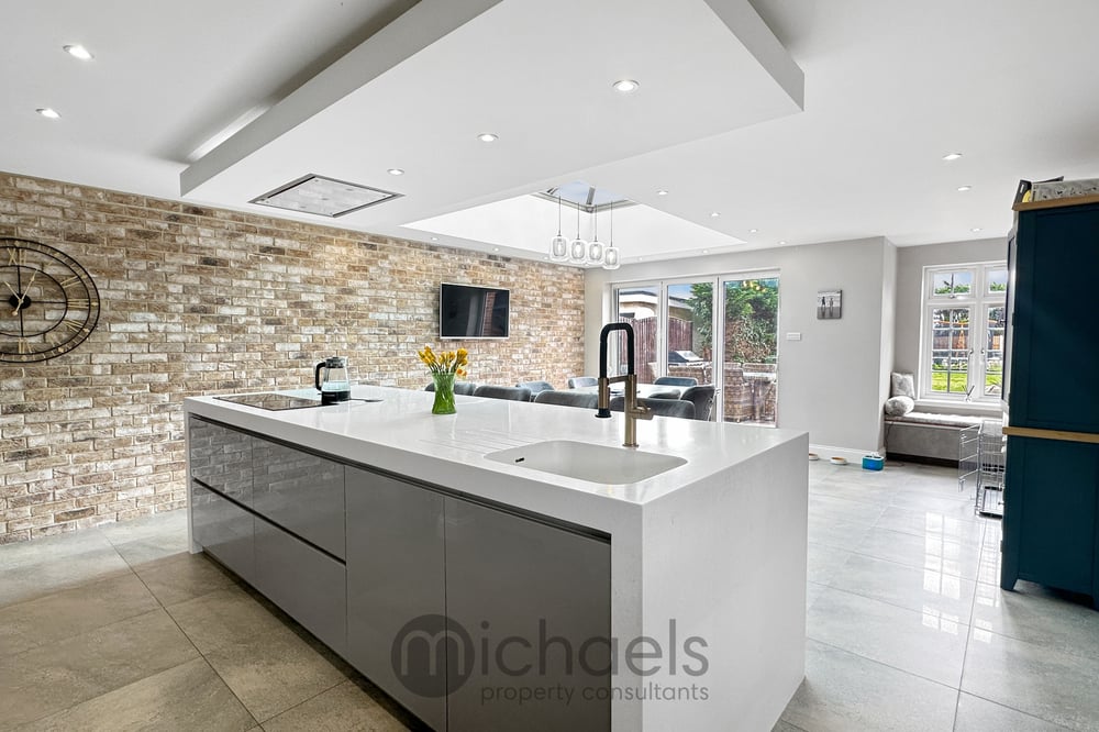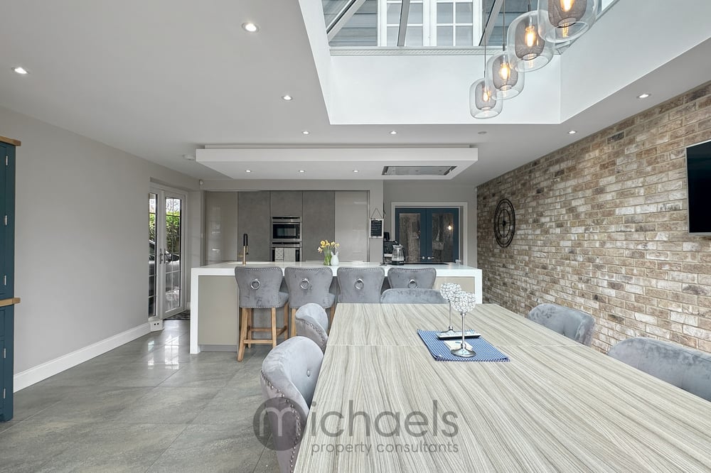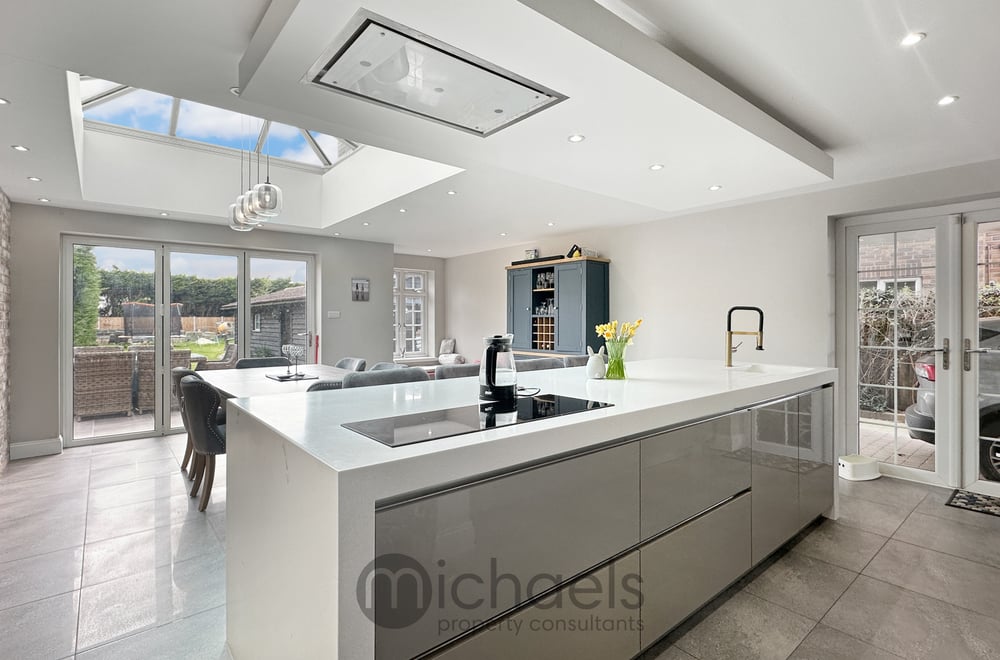 27' 0" x 17' 5" (8.23m x 5.31m) Full range of high specification units, cupboards and work surfaces, island comprising of induction hob and ceiling extractor, spot lighting, tiled flooring, inset appliances such as dishwasher, microwave and fridge/freezer, French doors to side, skylight lantern window, bi folding doors to rear aspect.