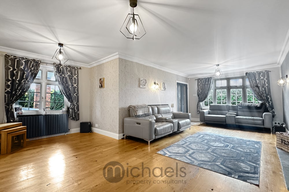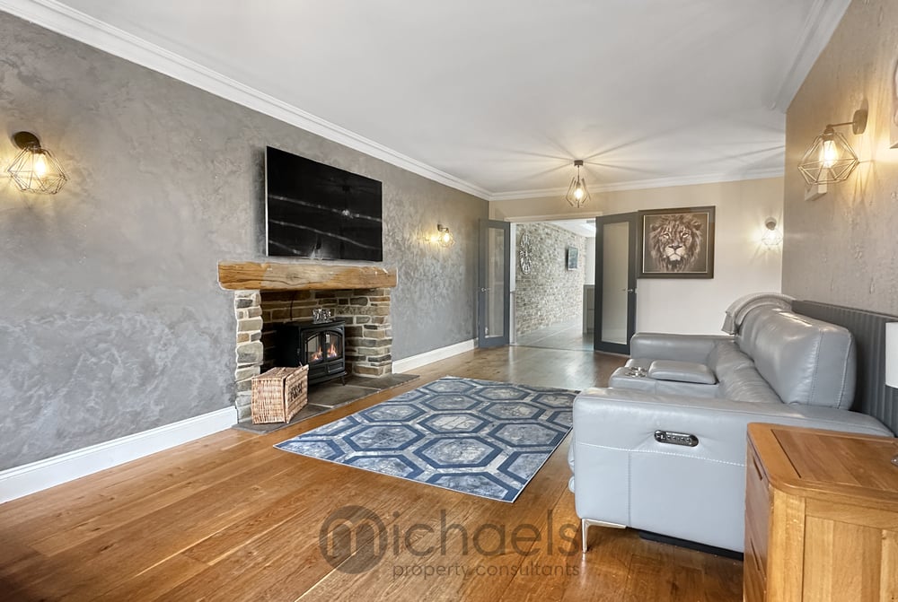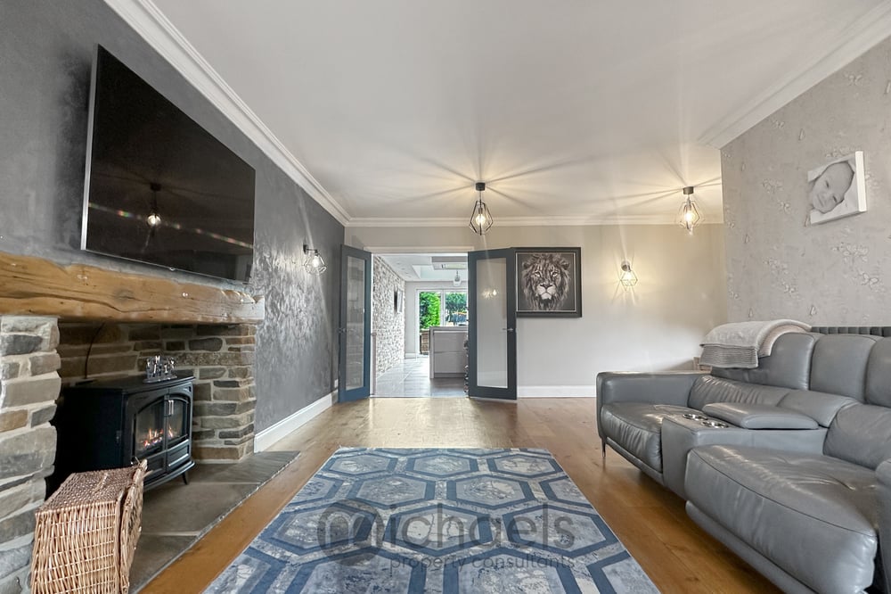 24' 7" x 17' 10" (7.49m x 5.44m) UPVC window to front aspect, radiators, exposed brick fireplace with log burner, wall mounted lighting, double doors into: