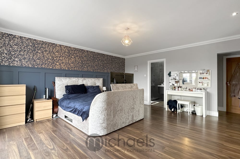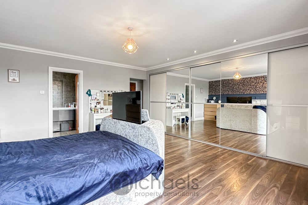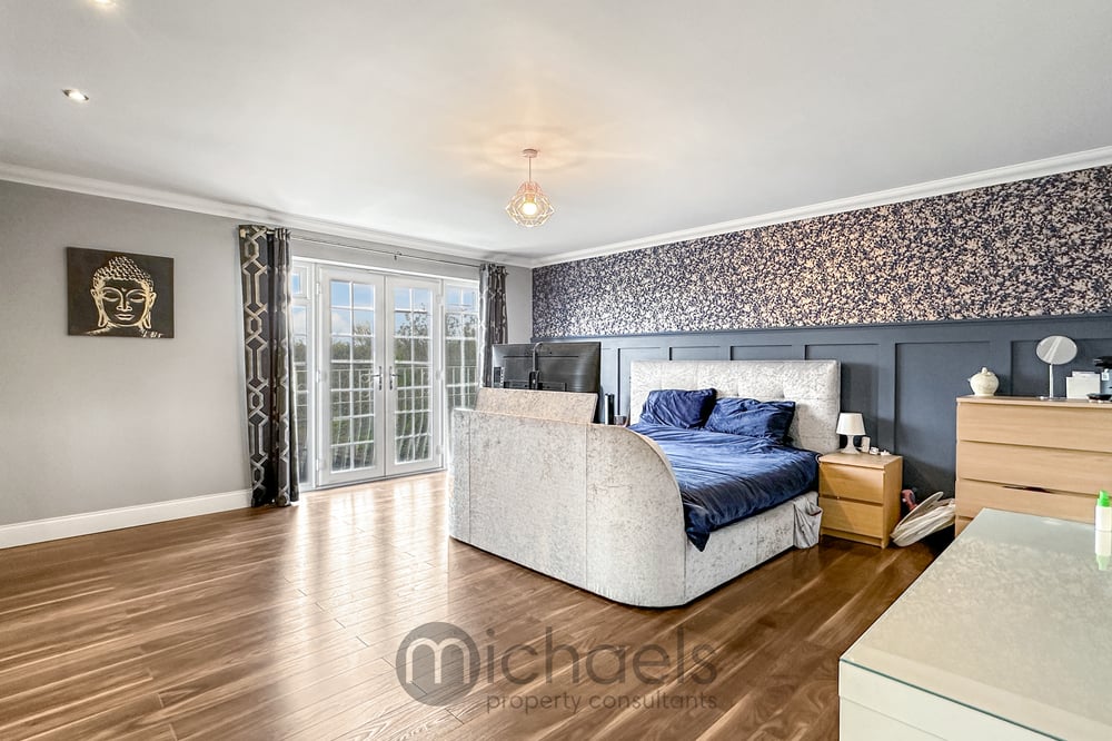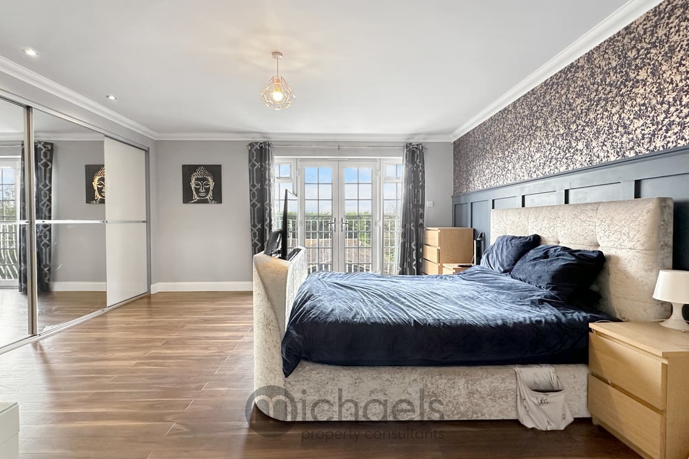17' 0" x 17' 0" (5.18m x 5.18m) Large built in wardrobes, French doors opening out onto Juliette balcony, wood effect flooring, spot lighting, panelled wall, door leading to: