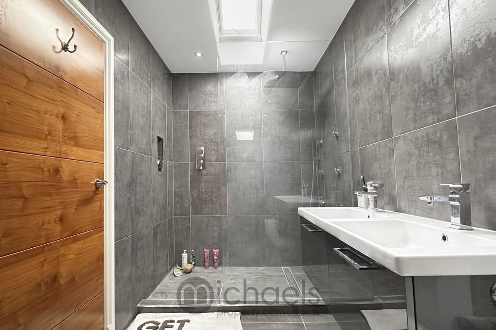Large shower cubicle, his and hers sinks, tiled walls and flooring, Velux window, vanity wash basin.