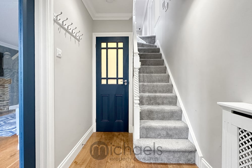 Main entrance door into hallway, wood flooring throughout, spot lights, radiator, stairs to first floor, door to: