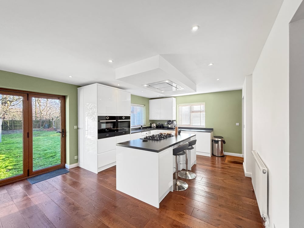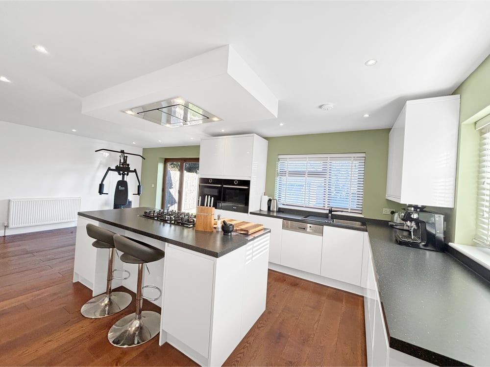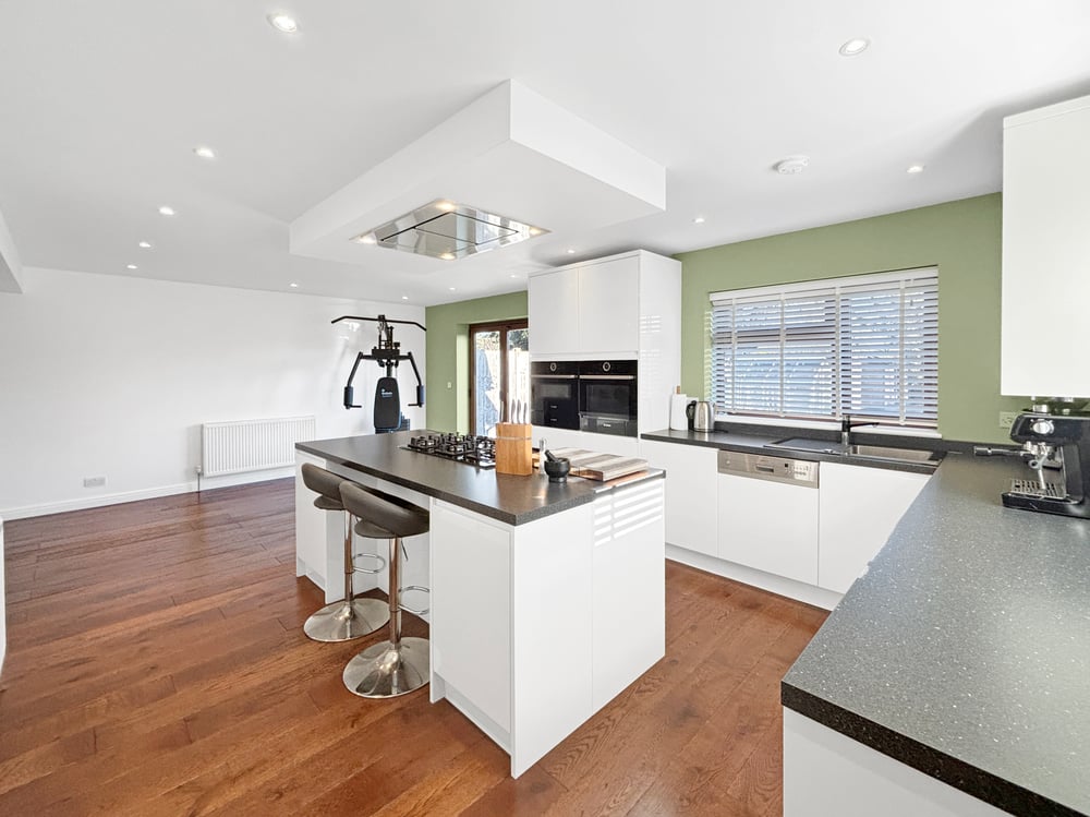 23' 01" x 13' 8" (7.04m x 4.17m) UPVC front door, double glazed window to rear and side, two radiators, inset spot lights, modern fitted kitchen including a range of wall and base units, island with space for breakfast stools, laminate worktops, integrated dish washer, double oven, warming drawer, gas hob and ceiling mounted extractor hood, fridge/freezer, open plan onto the dining area with views onto the rear garden.