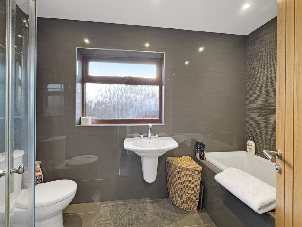 Double glazed obscured window to side, inset spot lights, tiled floor and walls, towel radiator, wall hung basin, low level WC, shower encloser, paneled bath.