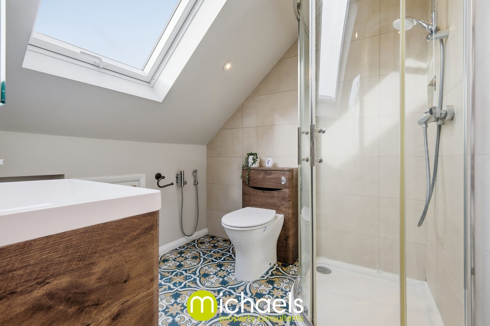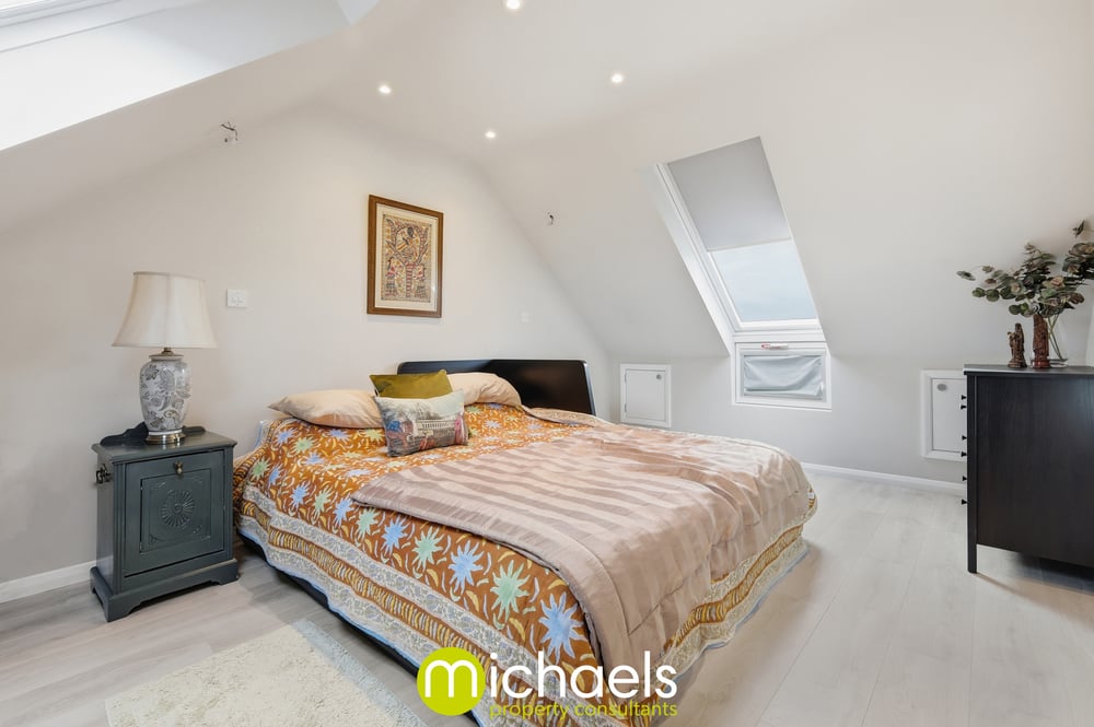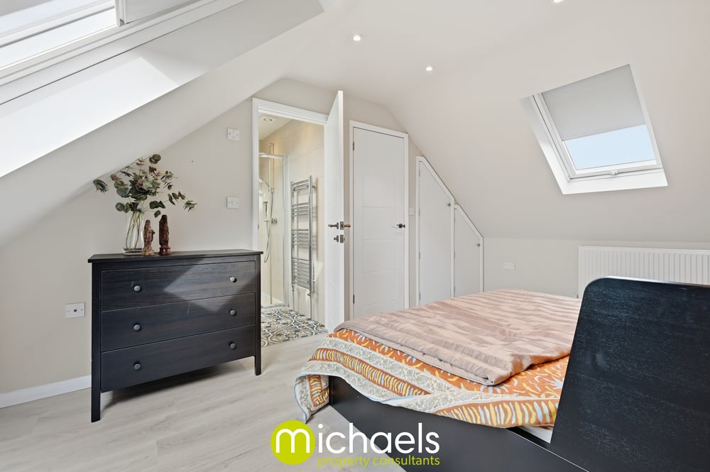 The second floor is occupied by an impressive loft-converted master bedroom, benefitting from eaves storage, dual-aspect Velux windows and a private en-suite shower room.