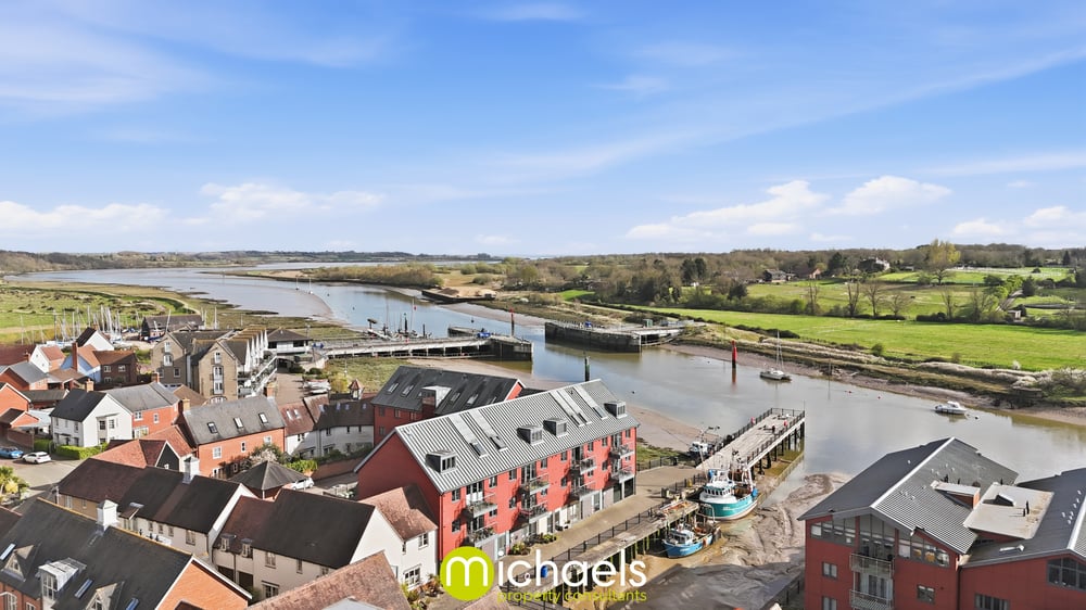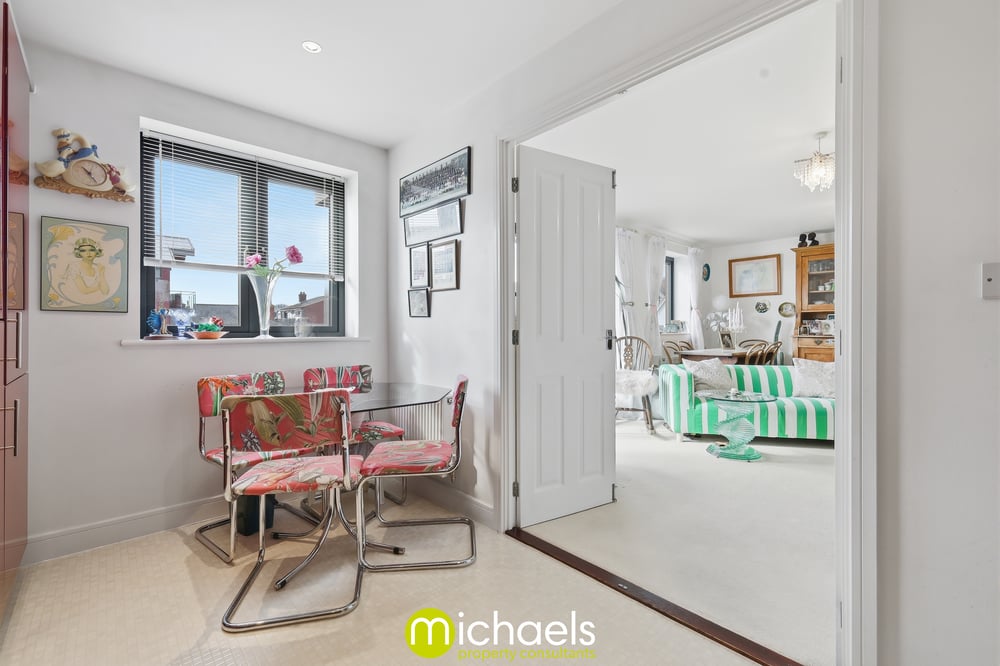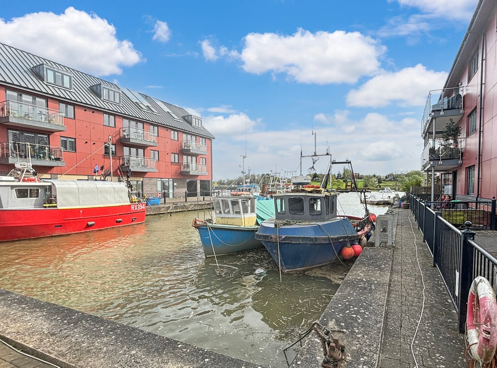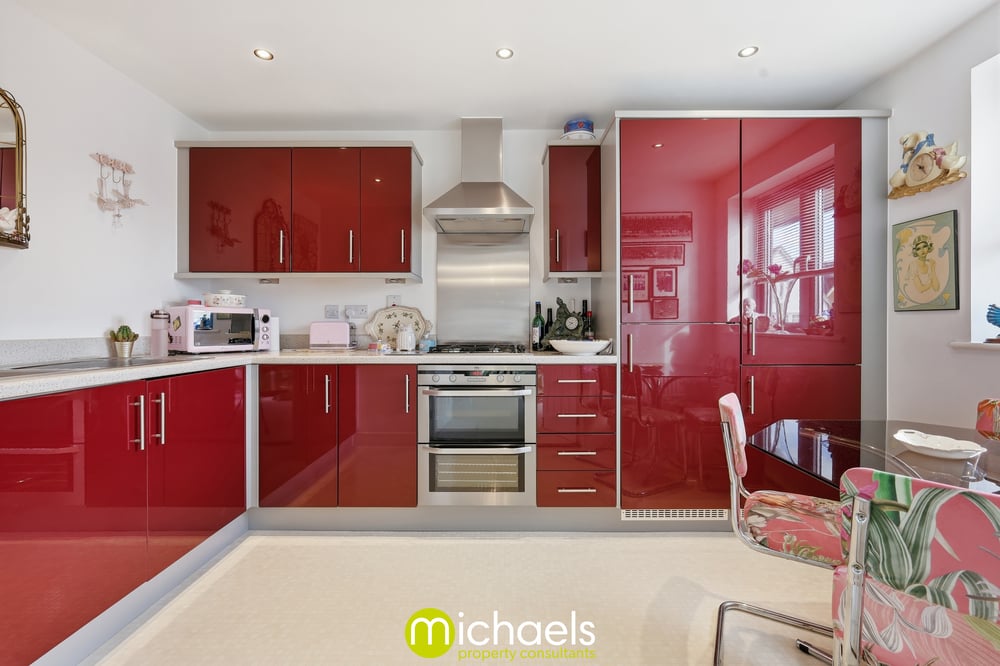 Double glazed window to front with river view, inset spotlights, radiator, fitted modern gloss kitchen with worktop, inset sink, gas hob, extractor fan, built in oven, integrated fridge/freezer, integrated dish washer, intergraded washing machine, open onto the living room.
