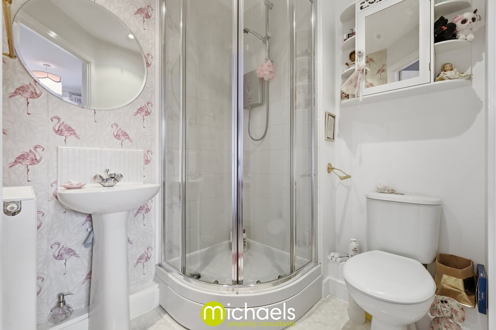 Shower cubicle, WC and wash basin, inset spotlights, radiator.