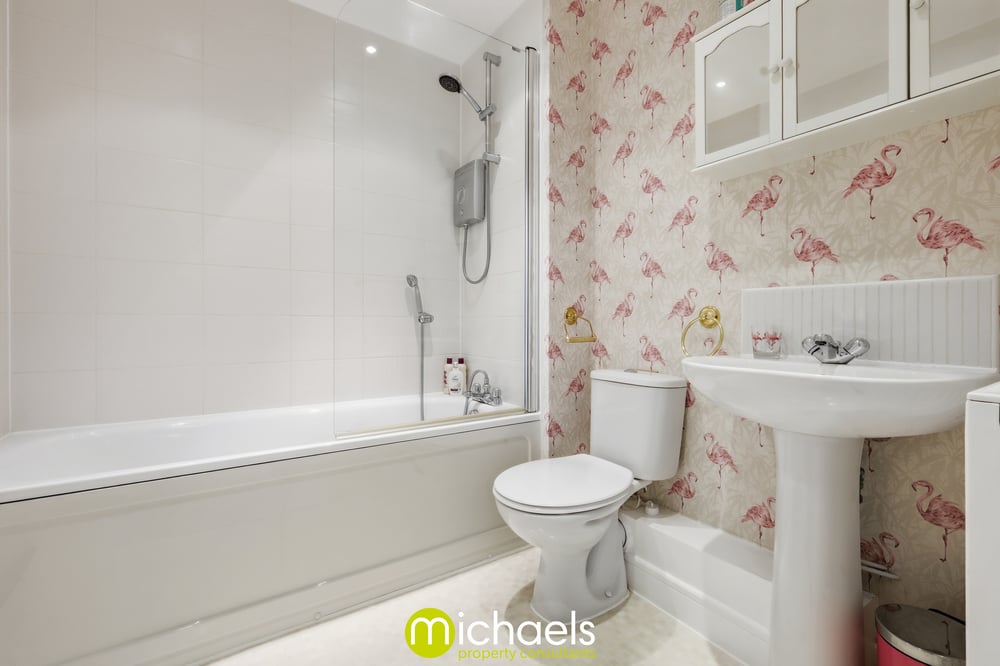 Jack and Jill bathroom, inset spot lights, bath with additional shower over, WC, wash basin, inset spotlights, radiator.