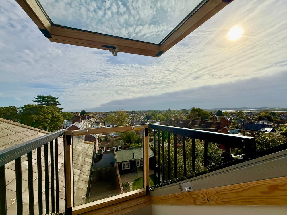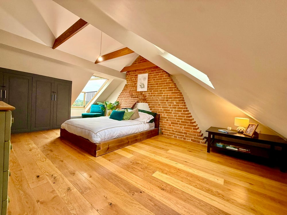 19' 05" x 12' 08" (5.92m x 3.86m) Bedroom 14' 8" x 13' (4.47m x 3.96m) Velux window to front, Velux balcony to rear with astonishing views across the rooftops of Wivenhoe oak engineered flooring, feature red brick chimney breast and exposed beams, radiator, fitted wardrobes.