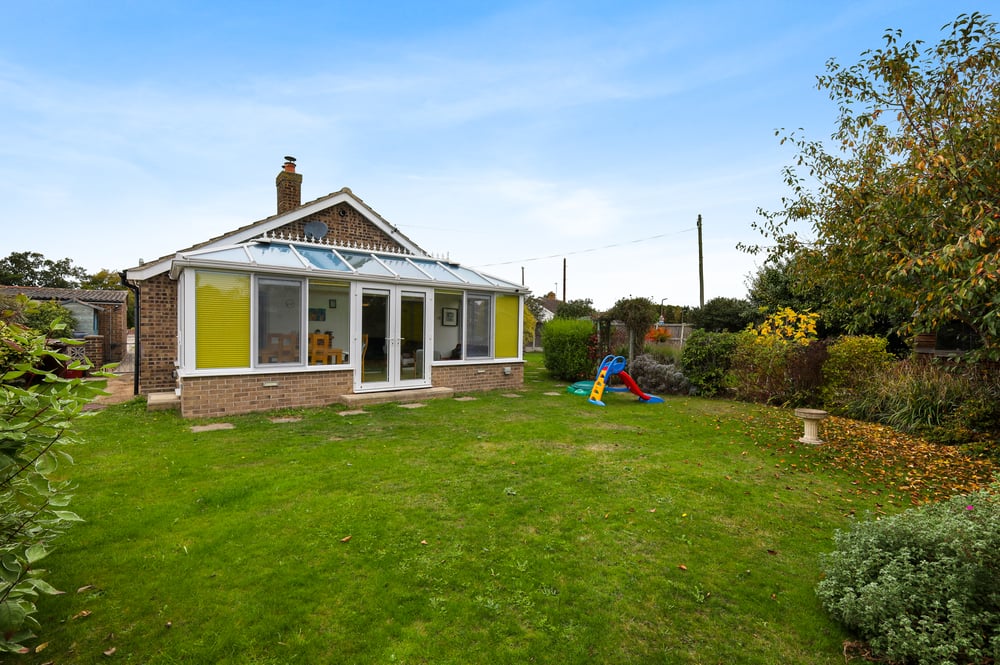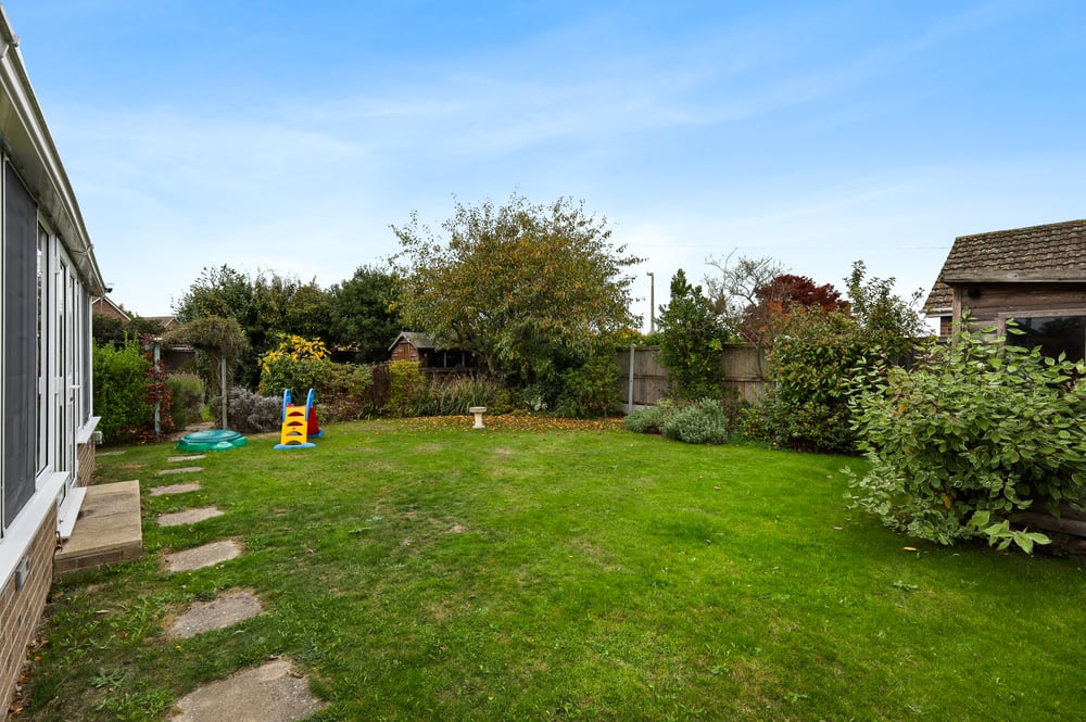 This wonderful plot wraps around the home and is enclosed by fencing and hedging. with gated side access, garden sheds, a variety of trees, shrubs and plants and is mainly laid to lawn.