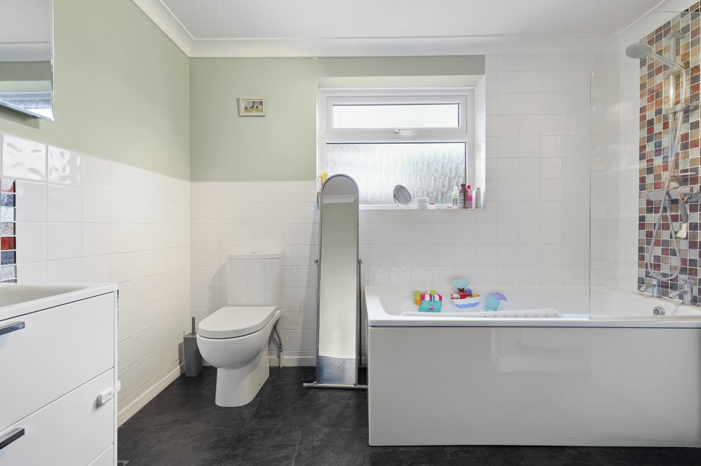 10' 2" x 8' 2" (3.10m x 2.49m) Obscure window to side, panel bath with screen and shower over, close coupled WC, vanity wash hand basin with built in drawers, storage cupboard, heated towel rail, electric radiator, half tiled walls.