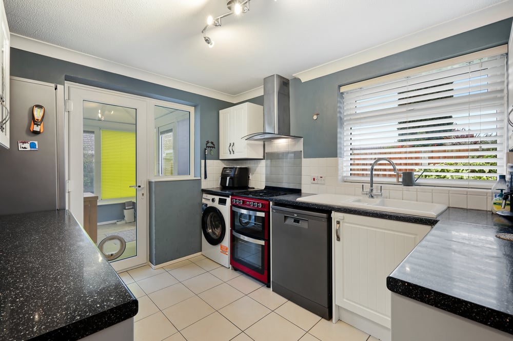 10' 5" x 10' 2" (3.17m x 3.10m) Window to side, door and window to garden room, tiled floor, a modern range of fitted units and drawers with worktops over, inset ceramic sink and drainer, tiled splash backs, extractor hood, space for oven, space for washing machine, space for fridge/freezer door to hallway.