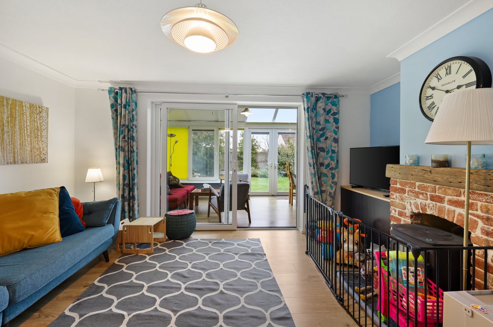 15' 1" x 14' 0" (4.60m x 4.27m) Patio doors to garden room, radiator, red brick fireplace with wood mantel and stone hearth, inset multi fuel burner.