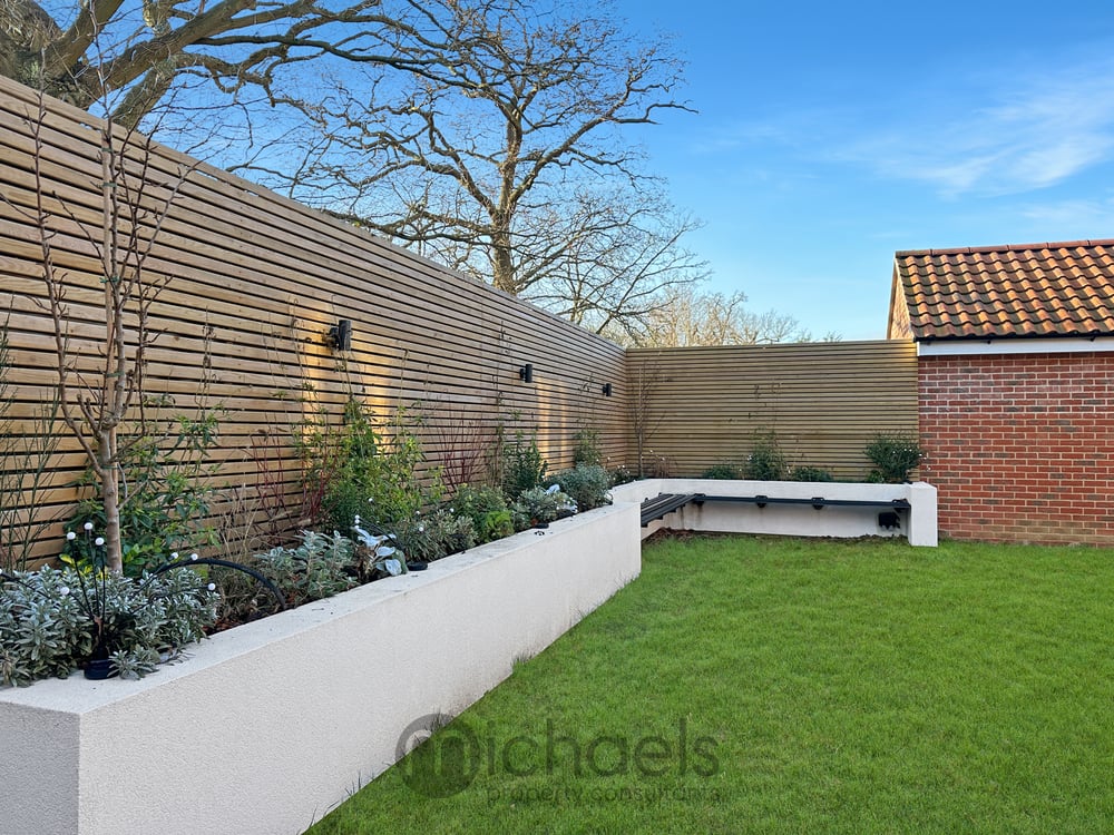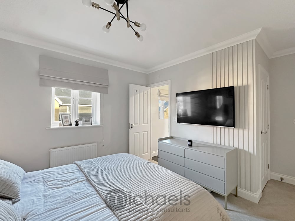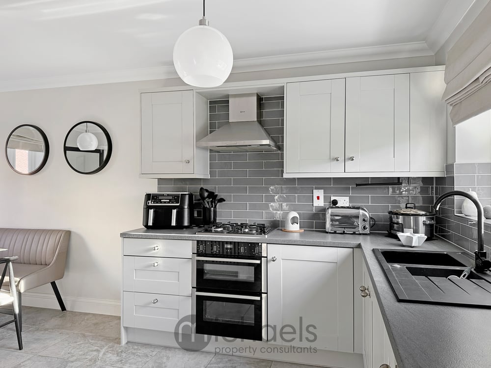 Outside, the garden commences with a patio area, that offers itself as the ideal place for outdoor furniture and al-fresco dining. A large proportion of the garden is laid to lawn, whilst positioned to the rear of the garden is a seating area surrounded by cedar fencing with downlighters and inset flower beds. Gated side access leads to a front driveway, offering off road parking for two vehicles in tandem style. A garage is available with an up-and-over door, ideal for additional storage.