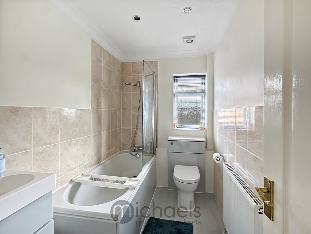 2.72m x 1.67m (8' 11" x 5' 6") Window to side aspect vanity basin, panel bath with shower and screen, W.C, radiator