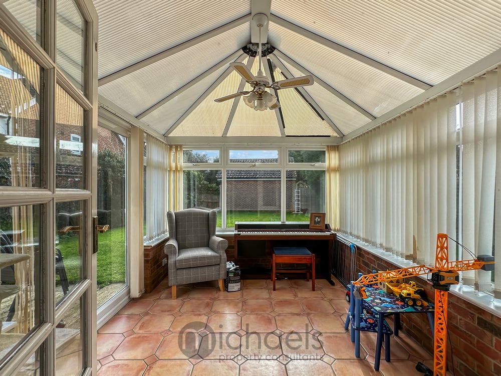Window to side and rear aspect, patio doors to side aspect (leading to rear garden), wall mounted electric heater, tiled floor