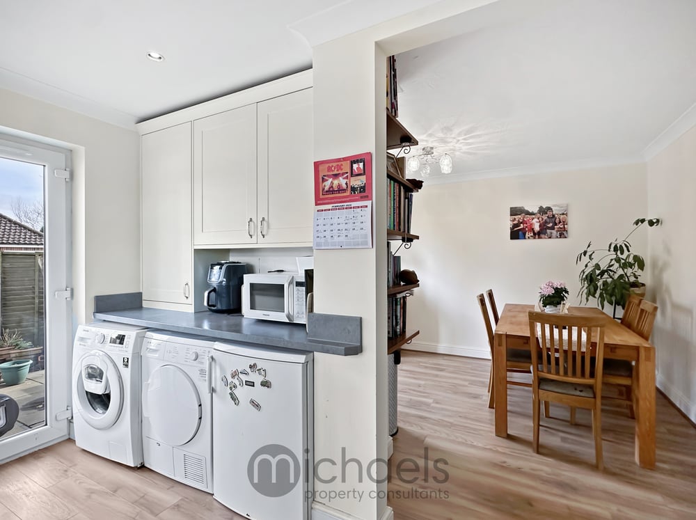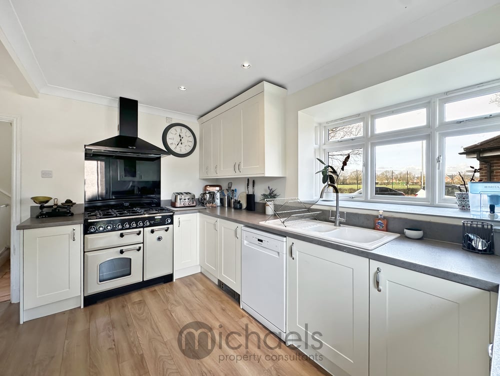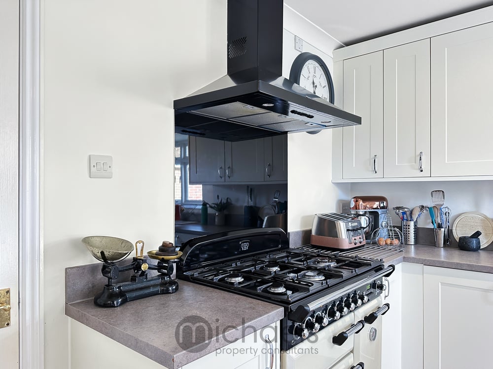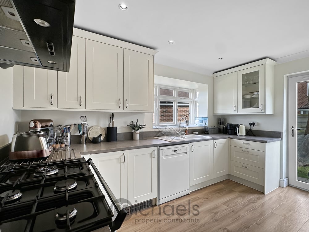 5.65m x 3.99m (18' 6" x 13' 1") A modern fitted kitchen-diner comprising of; a range of base and eye level fitted units with work surfaces over, dual range style oven with extractor fan over, inset ceramic sink, drainer and tap over, space and plumbing for further appliances including; dishwasher, washing machine, tumble dryer, fridge/freezer, glazed door to side aspect (x2) leading to rear garden, window to side aspect, radiator