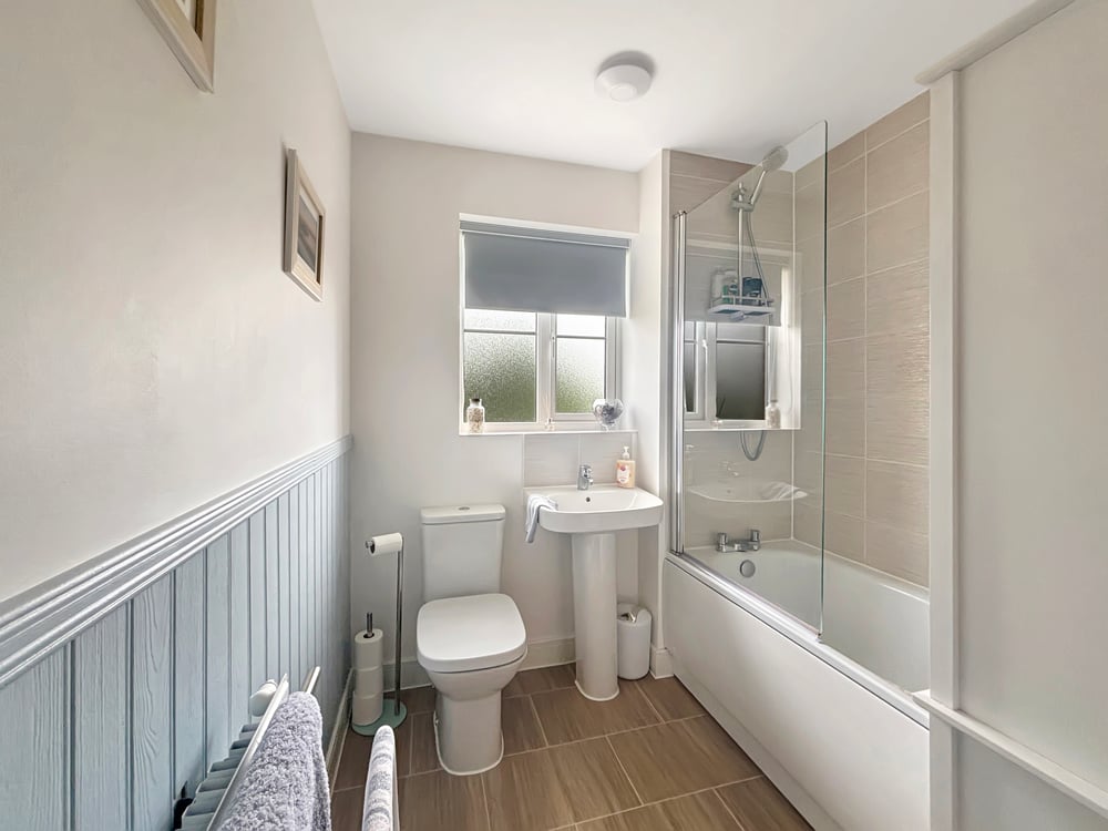 Obscure window to rear, radiator, tiled floor, half tiled walls, ceiling fan, panelled bath with shower and screen over, pedestal wash hand basin, close coupled WC.