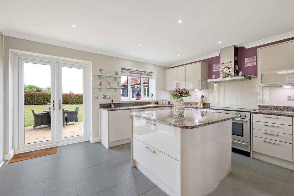The impressive ground floor accommodation comprises a welcoming entrance hall with a solid oak staircase, a cloakroom, a spacious living room, a formal dining room, a snug/study, and a large kitchen/breakfast room. The kitchen features a central island and granite worktops, and opens into a recently added sunroom that brings in an abundance of natural light.