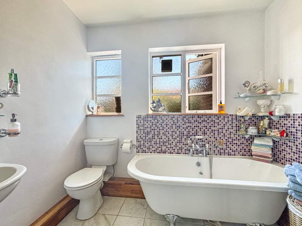 Two obscure windows to rear, marble tiled floor, free standing bath, shower, heated towel rail, pedestal wash hand basin, close couple WC, dimplex heater.