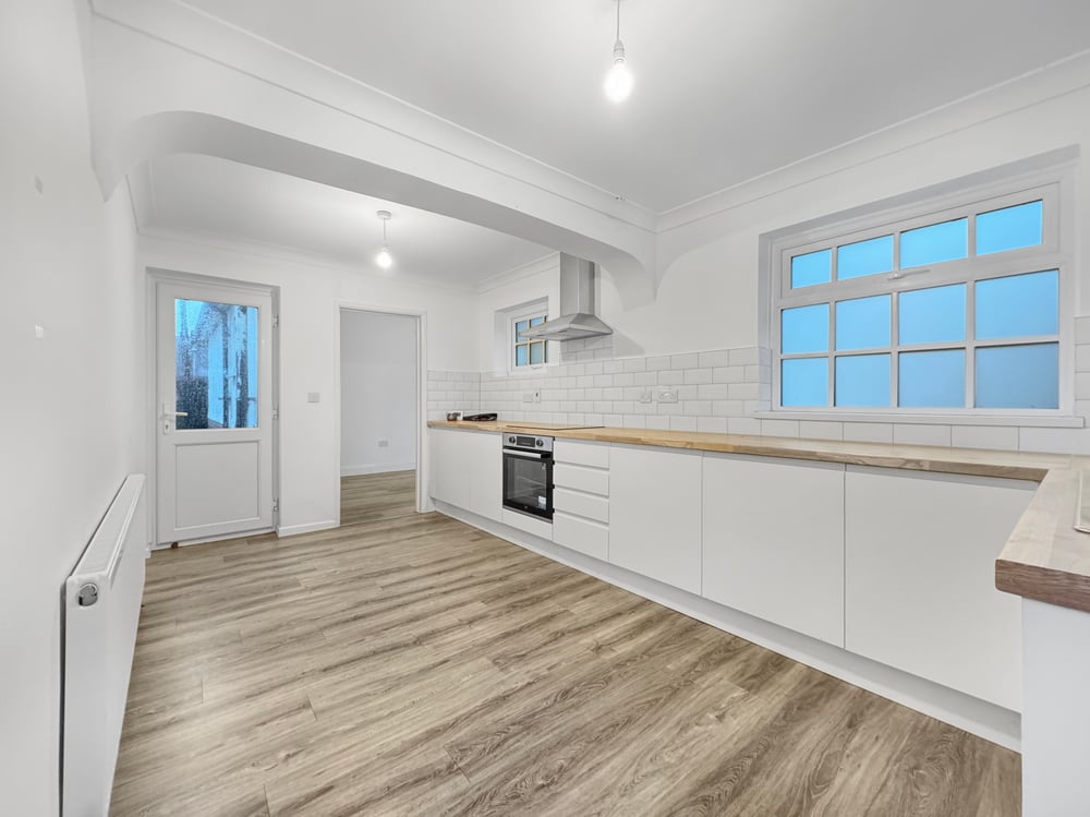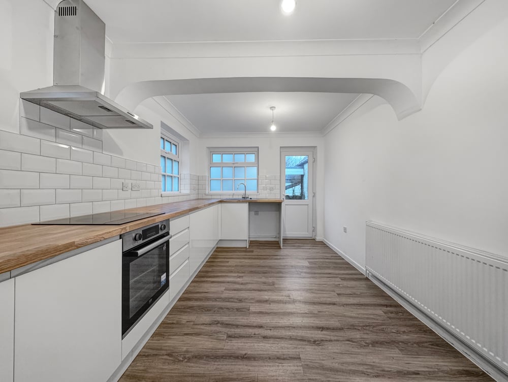 15' 8" x 9' 0" (4.78m x 2.74m) Wood effect flooring, radiator, door to rear, window to rear, windows to side, a modern range of fitted units and drawers, fitted oven, fitted hob, extractor, tiled splashbacks, inset sink.