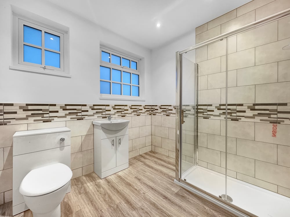 8' 4" x 8' 4" (2.54m x 2.54m) Two obscure windows to rear, large walk in shower, vanity wash hand basin, vanity WC, half tiled walls, heated towel rail, wood effect floor.