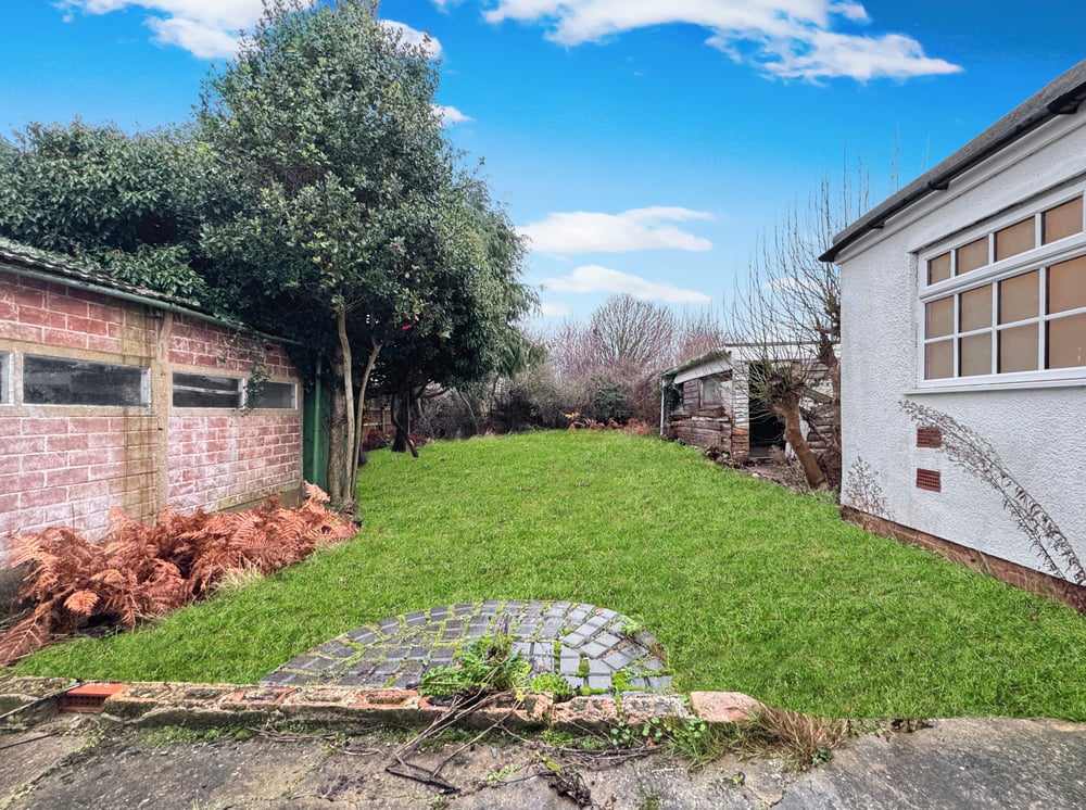 Mainly lawn with various sheds, trees, shrubs and plants, gated side access.