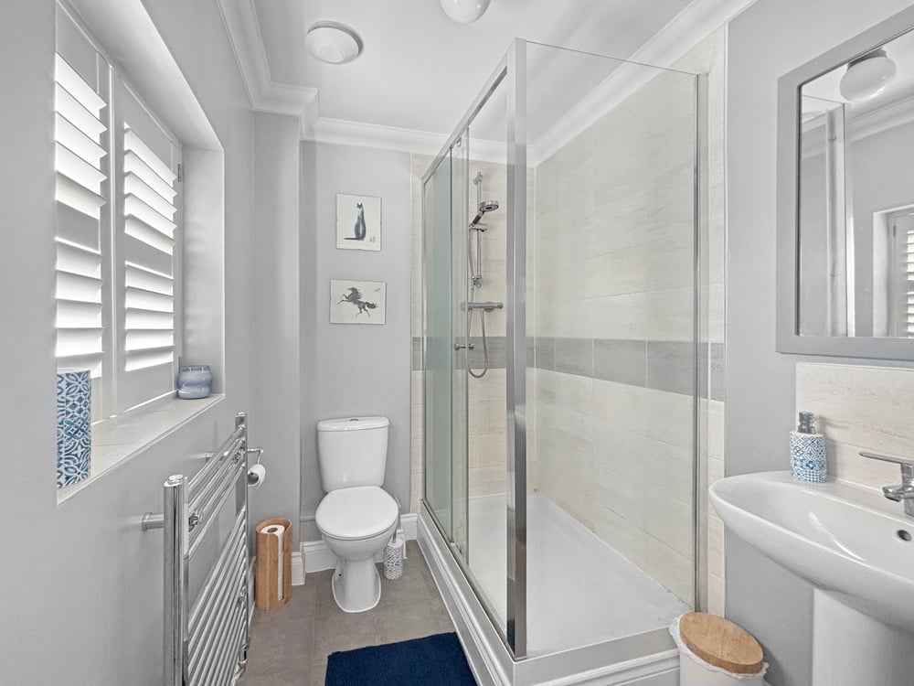 Double glazed obscure window to the front, tiled splash-back, heated towel rail and shower encloser.