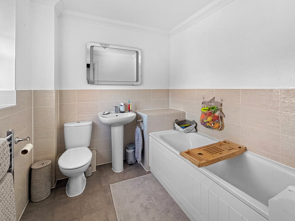 Double glazed obscure window to the rear, heated towel rail, panelled bath with over head shower, low level WC, hand basin and half tiled walls.