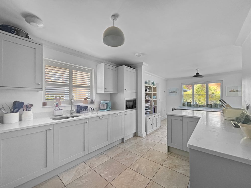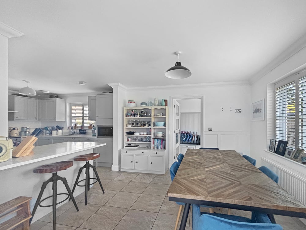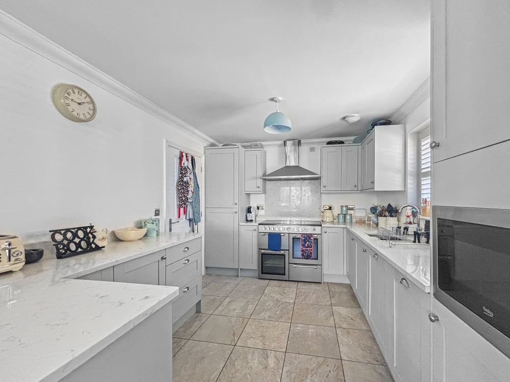 23' 7'' x 9' 11'' (7.18m x 3.02m) Double glazed window to the side and rear with shutters, tiled flooring, fitted shaker style kitchen including a range of wall units and base units/draws, inset sink with drainer quartz worktops, breakfast bar integrated fridge freezer, dish washer, Range style oven with extractor fan over and microwave.