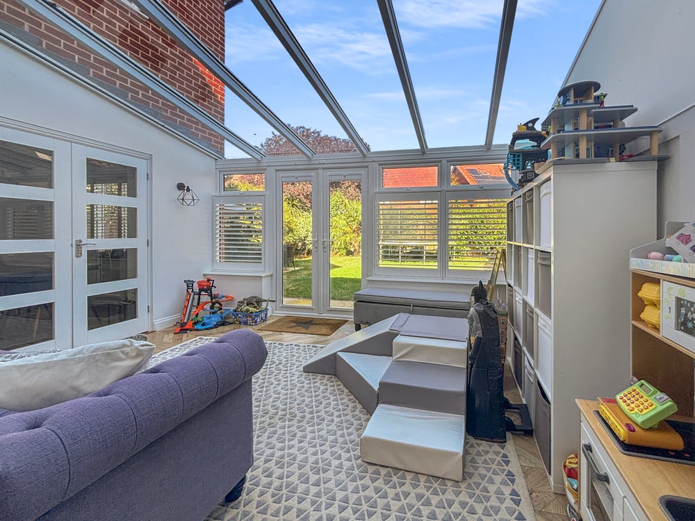 Double glazed window to the rear and side, French doors to the rear garden, shutters, wall lights and panelling.