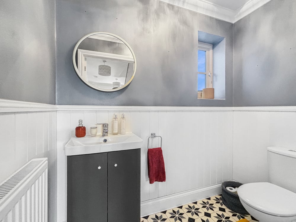 Obscure double glazed window to the rear, low level WC, l wash hand basin and radiator.