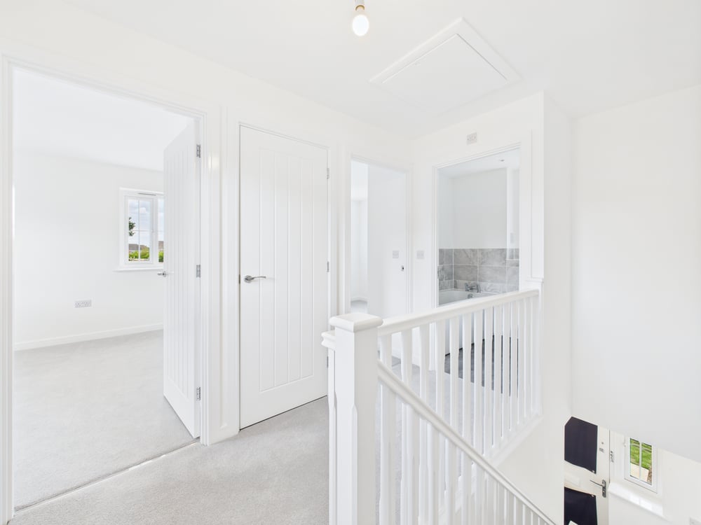 Upstairs, the landing leads to three well-proportioned bedrooms. The main bedroom includes a contemporary en-suite shower room, while a sleek family bathroom serves the remaining rooms.