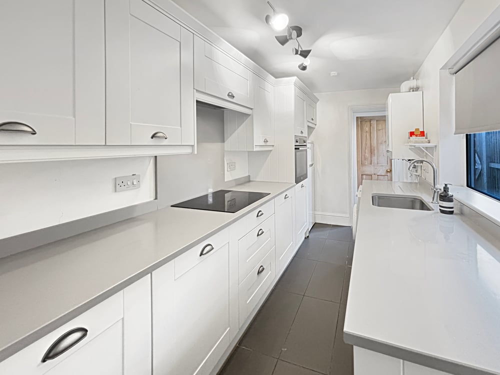 12' 0" x 6' 4" (3.66m x 1.93m) Double glazed window to side, tiled floor, integrated kitchen including a range of wall and base units, quartz worktops, wall mounted gas combination boiler, inset sink set into work surface, electric hob, built-in oven, plumbing for washing machine and space for fridge/freezer.