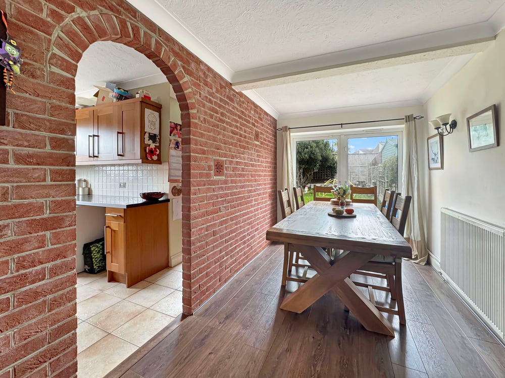 14' 1" x 8' 9" (4.29m x 2.67m) French doors to rear, wood effect flooring, radiator, feature brick wall with arch to kitchen.
