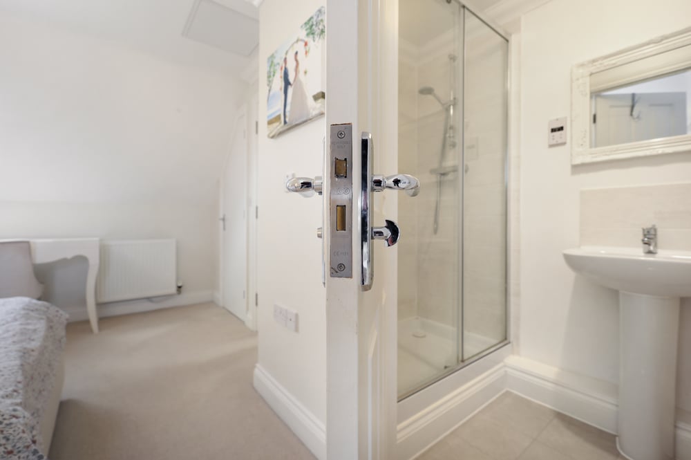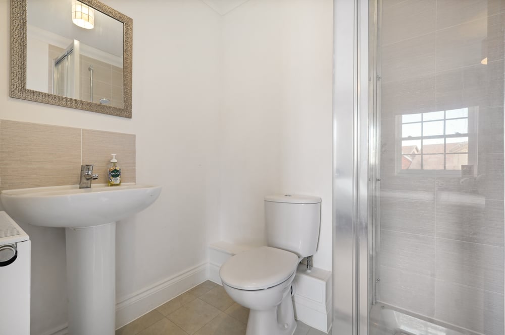 Low level WC, wash hand basin, double shower with tiled splash back, radiator.