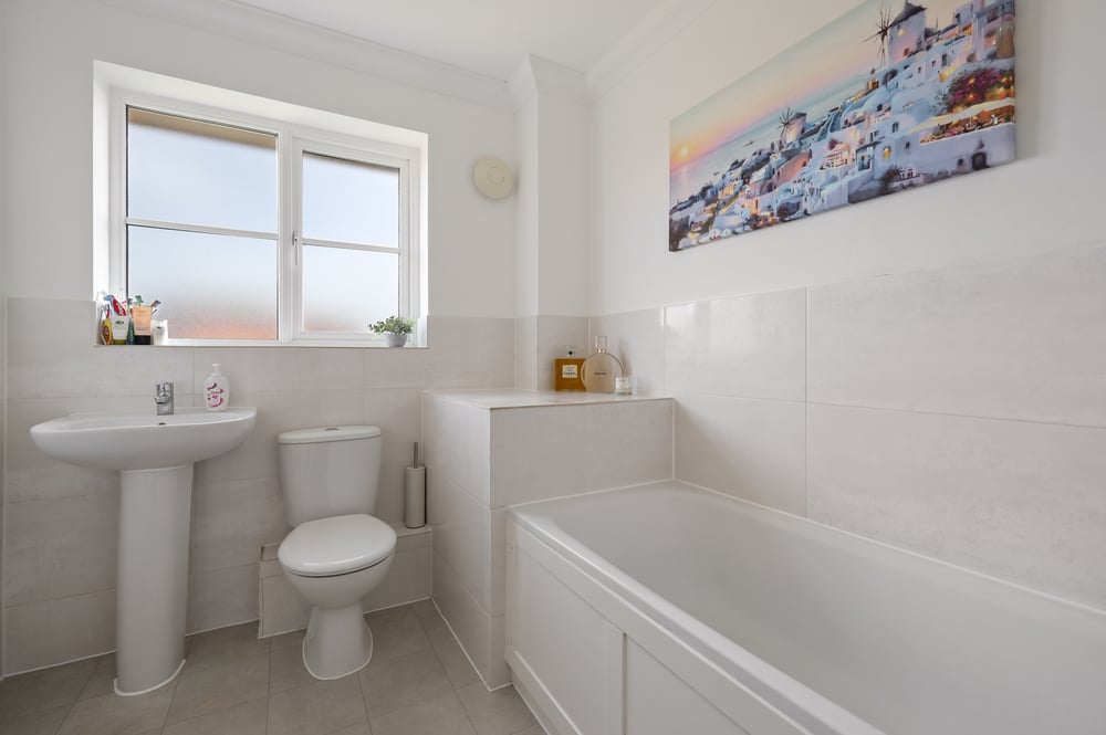 Double glazed obscure window to rear, paneled bath with over head shower, low level WC wash hand basin with tiled splash back and radiator.