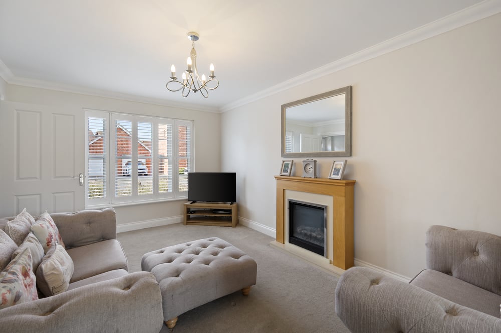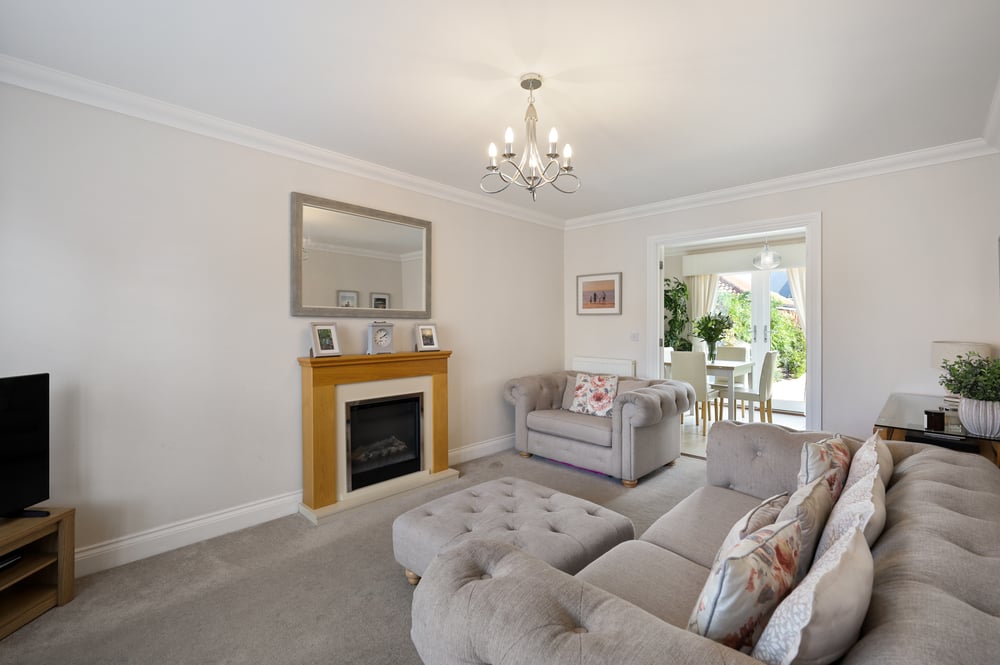 Double glazed UPVC window to front, feature fireplace with wooden surround, radiator, doors opening onto: