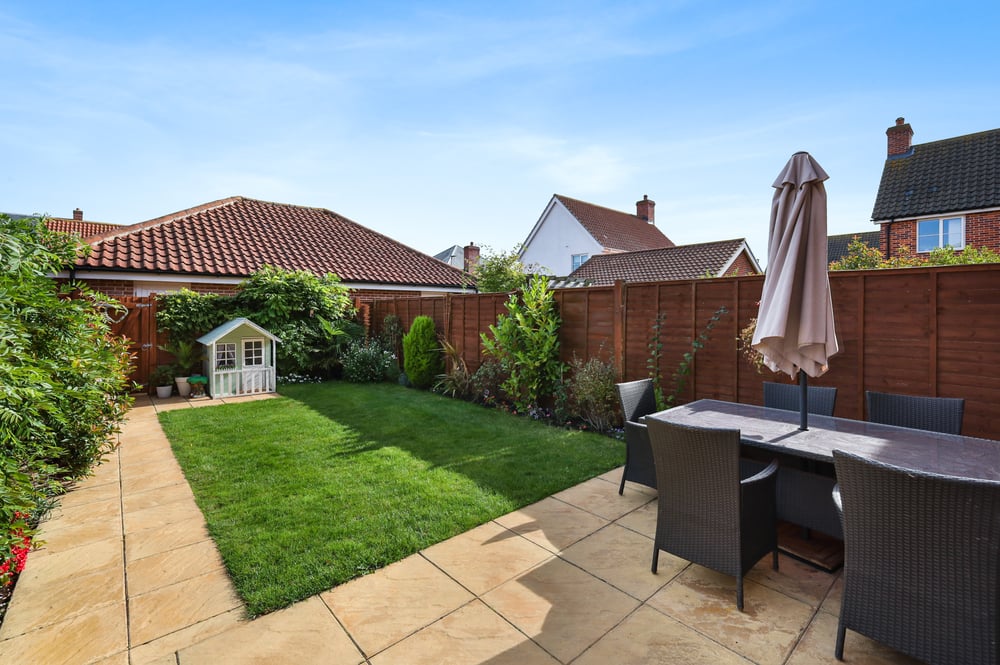 A well maintained rear garden mainly laid to lawn and patio area with mature shrubs and flowers with access to the garage and parking.