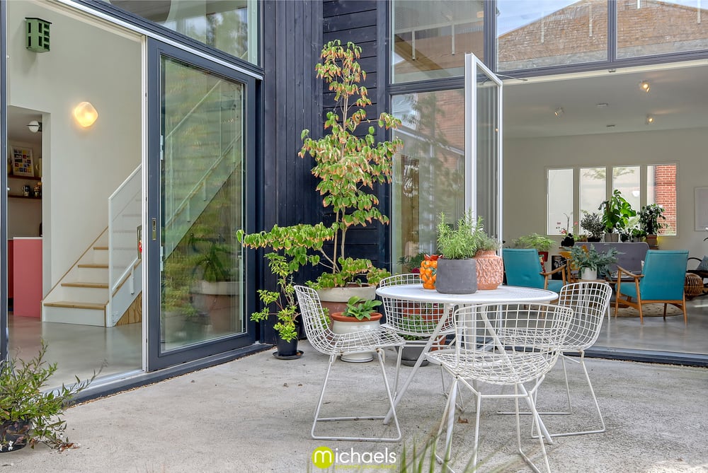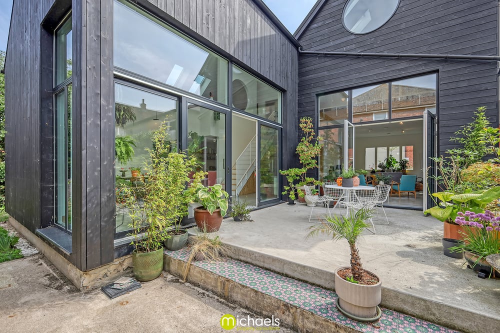 Drawing inspiration from Wivenhoe's rich maritime history , 18 St. Johns Road design features a double-gabled metal roof and dark timber cladding , the same features found in the area's historic warehouses. The house is divided into two volumes arranged around an internal courtyard and designed to be separable in the future with the open-plan spaces on the ground floor and the bedrooms above. The slope of the roofs creates a dynamic interplay between the spaces, with ceilings that rise and fall and a double-height area at the rear. Light is a key element in the design and so on the ground floor large glass doors open to the outside, while several skylights pierce the roof to let in the sun.