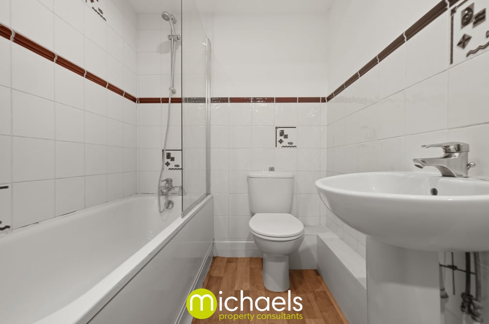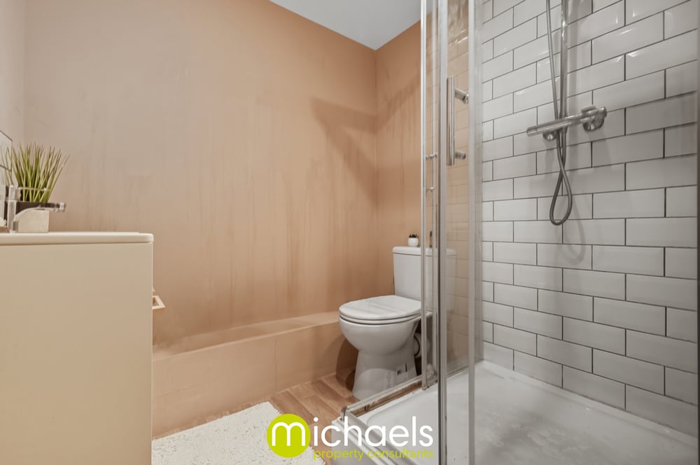 6' 10" x 5' 5" (2.08m x 1.65m) Low level W.C, vanity wash basin, bath cubicle with shower attached, tiled walls.
