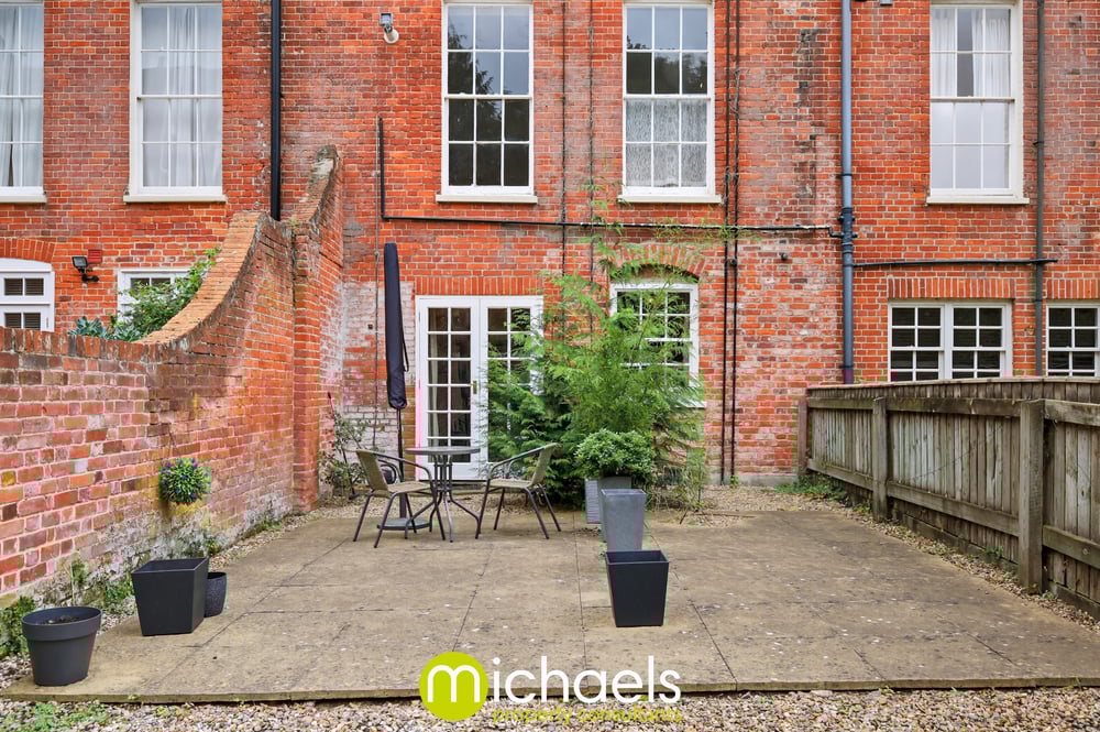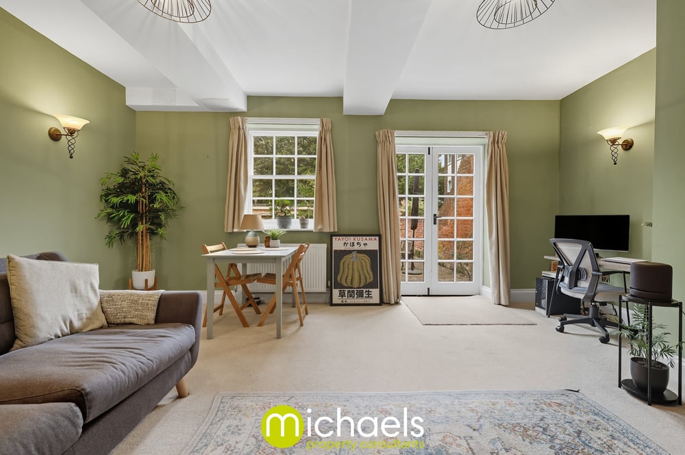 17' 8" x 14' 4" (5.38m x 4.37m) Wall mounted lighting, radiator, feature fire place, sash windows to rear aspect, French doors leading to courtyard style garden.