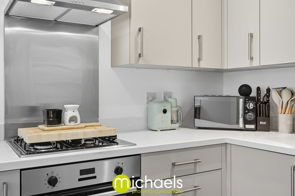 The ground floor comprises a welcoming entrance hall and a convenient cloakroom. The well-equipped kitchen offers space for appliances, which the vendors intend to leave for the benefit of the new owners. A bright and spacious living room provides an ideal space for relaxation, with patio doors opening onto a generous, private, and enclosed rear garden. Herringbone LVT flooring enhances the ground floor living space.