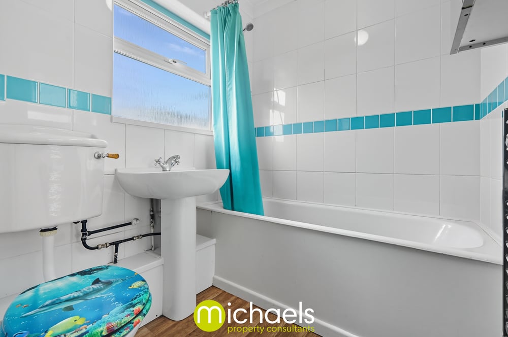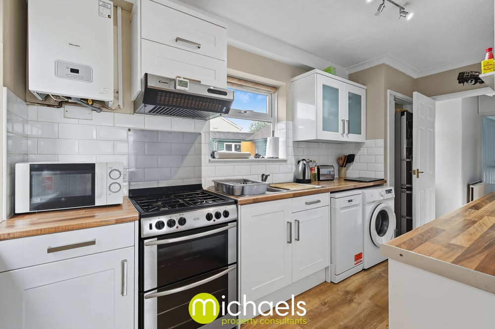 The ground floor comprises a welcoming entrance hall leading to both the living and dining rooms. The living room enjoys a feature fireplace and flows through to the kitchen, which is fitted with high-gloss units, a tiled brick splashback, and provides space and plumbing for appliances. A family bathroom with tiled walls completes the ground floor. Upstairs, there are two generous double bedrooms along with full-width eaves storage.